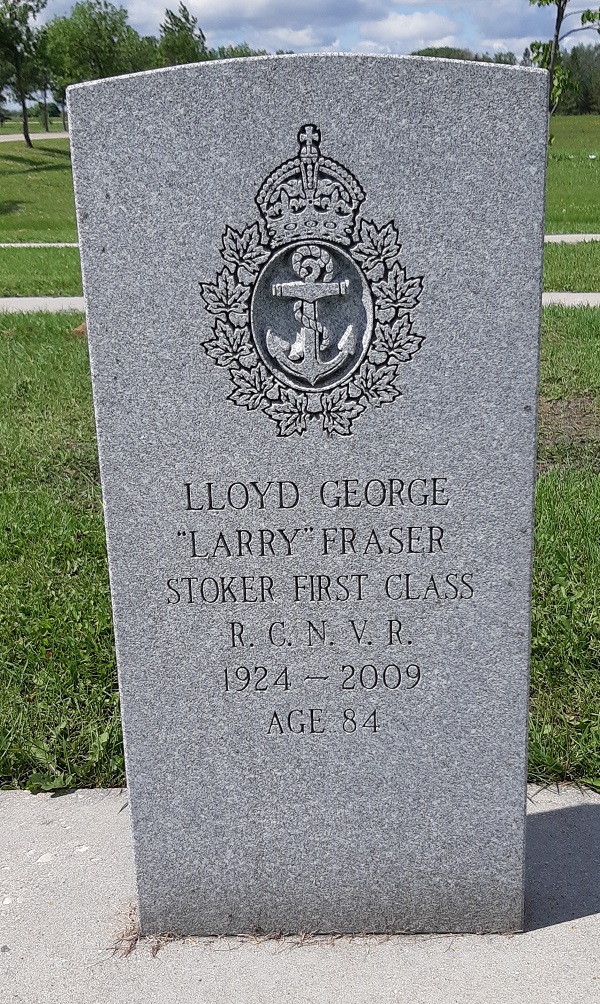 FRASER, Lloyd George (Larry) - It is with great sadness that we announce the passing of an outstanding husband and father Larry on April 13th, 2009 at Moog Hospice House in Penticton, B.C. with his wife Jeanne by his side. Larry was born and raised in Transcona, Manitoba predeceased by his father George, Mother Kathleen and brothers Mervin, Bryan and Lyle. Survived by his wife Jeanne, sons Larry (Rhonda) Grant (Kim) and Curt (Rhonda), sisters Georgeen Harris (Arthur), Veronica Fraser, nine grandchildren and one great grandchild. As a teenager Larry joined the Canadian Navy during the Second World War serving aboard HMCS Guysborough-Minesweeper which was sunk in the English Channel on March 17, 1945. After the services he attended the University of Manitoba studying Business Administration. He became a junior partner in Wiggins Adjustments Ltd and took over the company in 1958 expanding to six branch offices in western Canada. He was an avid pilot auditing his company by air. He also was a musician, leading his own band in Vancouver in the 70s. He was the author of two published books - Crossroads Capers in 1998 and The Dugald Disaster in 2002. He recently completed a teen novel Kelly Larkin In Space . Larry was proud to support and serve with the Gyro Club, Rotary, Masonic Lodge and Khartum Temple Shrine Oriental Band as the leader. He will be dearly missed by his family and the many friends who knew him. No service at Larry's request. Donations to charity of choice. Arrangements with Everden Rust Funeral Services. (the Winnipeg Free Press 18 Apr 2009)