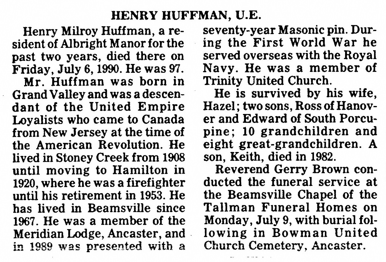 Mr. Huffman was born in Grand Valley and was a descendant of the United Empire Loyalists who came to Canada from New Jersey at the time of the American Revolution. He lived in Stoney Creek from 1907 until moving to Hamilton in 1920, where he was a firefighter until his retirement in 1953. He has lived in Beamsville since 1967. He was a member of the Meridian Lodge, Ancaster, and in 1989 was presented with a seventy-year Masonic pin. During the First World War he served overseas with the Royal Navy. He was a member of Trinity United Church.