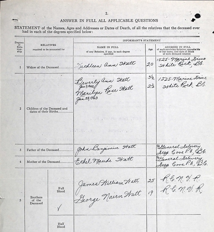 James' brother, John Arthur Watt, died in the explosion that destroyed the 29th Canadian MTB Flotilla in Ostend, Belgium on 14 Feb 1945.