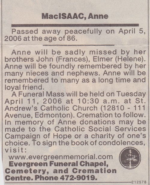 MACISAAC, Anne K. - passed away April 5, 2006 at the Royal Alexandra Hospital in Edmonton. Predeceased by her mother and father, Mod and Howard McIsaac; aunts, Mary, Annie and Lucy; cousins Ruth, Arnold and Vie. Survived by brother John and wife Francis; nephew Dr. Howard, Julie, Caroline and Kathryn; niece Maryanne, Ron, Laura and Michael; brother Dr. ER and wife Helen; nephew Dr. Gary, Wanda, Michael, Matthew, Sarah and Mark; niece Elaine, Maryn and Kaitlyn; niece Nancy, Bryan, Jordan, Kyle and Jessica; nephew Dr. Craig, Dr. Carrie, Max and Sam; cousins Birtha and David; dear friends Robbie Milner, Dorothy Howard and Margaret McDonald. Anne joined the woman's Navy, the Wrens in 1943 and after discharged from the Navy she taught school in Lebret, Fort Qu'Appelle and in the Federal Government for the Indian department. The service will be held at a later date in Balcarres with a burial to follow. (The Regina Leader-Post 07 Apr 2006)