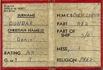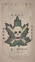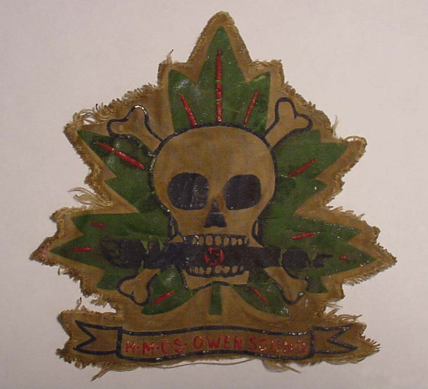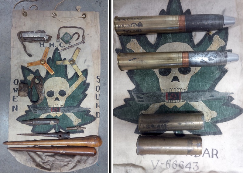 (DD01) Page 2 of Dan's Certificate of Service (DD02) Dan's duffle bag with HMCS OWEN SOUND gunshield art painted on it (DD03) Some of Dan's wartime memorabilia laid out on his duffel bag. The shells on the right are Pom pom shells (DD04) A very well worn HMCS OWEN SOUND jacket patch (DD05) Dan's HMCS OWEN SOUND station card