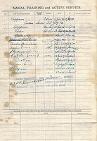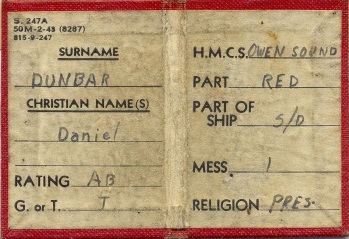 Ships served in: HMCS CHIPPAWA - Enlisted 16 Jul 1942. Commenced Active Service 28 Jul 1942 HMCS NADEN - Drafted to NADEN 13 Sep 1942 as an OS, RCNVR HMCS STADACONA - Drafted to STADACONA 01 Dec 1943 as an OS, RCNVR HMCS OWEN SOUND - Served in Owen Sound 14 Dec 1943 as an OS, RCNVR * Rated AB 26 Jul 1944 HMCS SCOTIAN - Drafted to SCOTIAN 17 Jul 1945 as an AB, RCNVR HMCS LEVIS - Served in Levis 23 Jul 1945 as an AB, RCNVR HMCS PEREGRINE - Drafted to PEREGRINE 01 Oct 1945 to commence demobilization process HMCS CHIPPAWA - Drafted to CHIPPAWA 09 Oct 1945 as an AB, RCNVR. Demobilized 12 Nov 1945