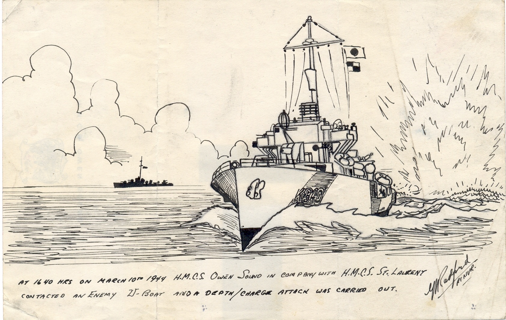 (DD10) HMCS OWEN SOUND K340 stationary (DD11) Sketch of HMCS OWEN SOUND K340, in company with HMCS ST LAURENT, attacking a U-boat (DD12) Here's to the little Corvette, Lads - by LS Radford, RCNVR, HMCS OWEN SOUND K340 (DD13) HMCS OWEN SOUND K340 shortly after commissioning (DD14) HMCS OWEN SOUND K340