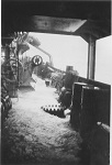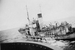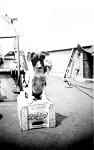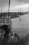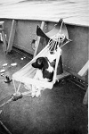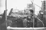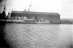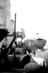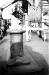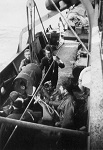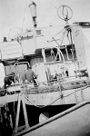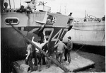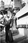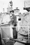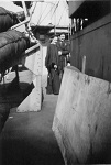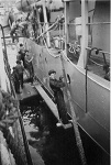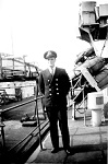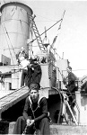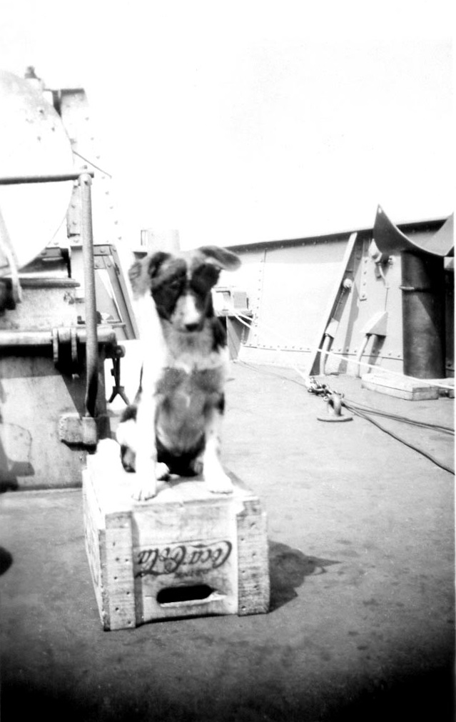 (DD80) HMCS OWEN SOUND'S mascot sitting on a coca-cola crate on the quarterdeck (DD81) HMCS OWEN SOUND'S mascot sitting on a bollard on ship. This photo must have been taken shortly aftere they got him as he looks more like a pup than in the preceding photos. (DD82) Dan Dunbar (left) with 2 shipmates on HMCS OWEN SOUND K340 (DD83) Unknown sailor on HMCS OWEN SOUND K340 (DD84) Sailor on a cat between the ship and the jetty while a shipmate on the jetty looks on
