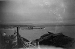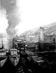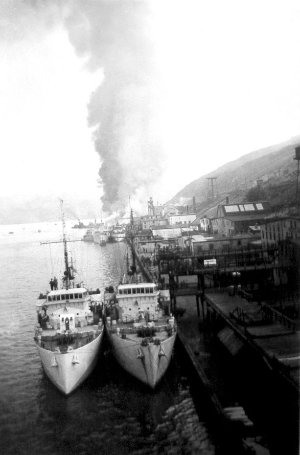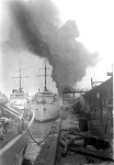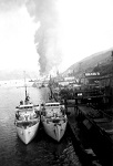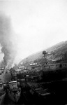 (DD201-DD204) Building on fire in the dockyard at St. John's, Newfoundland. Note the sailors on top of the bridges of their ships to get a better view. 2nd, 3rd and 4th photos taken from the crow's nest of HMCS OWEN SOUND K340