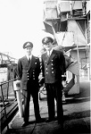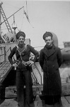 A couple wrens onboard HMCS OWEN SOUND K340 (DD182) The Quartermaster with unknown shipmate - perhaps his bosn's mate - on the jetty by HMCS OWEN SOUND K340