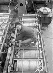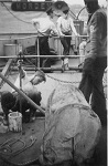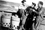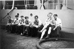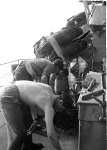 (DD163) Two unknown sailors on HMCS OWEN SOUND K340 (DD164) Two unknown sailors cutting the lashing on a depth charge with an axe on HMCS OWEN SOUND K340. Webmaster's note: Striking a steel drum that contains 200 to 500 lbs of explosives with an axe ... what could possible go wrong? (DD165) Unknown sailors on HMCS OWEN SOUND K340 (DD166) "Chum sitting on the D/C rails" on HMCS OWEN SOUND K340 (DD167) Unknown sailors on HMCS OWEN SOUND K340