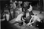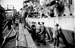 (DD25) Dan Dunbar (right) helping a shipmate across the gangway on to HMCS OWEN SOUND K340 (DD26) Unknown sailors sitting on the jetty with HMCS OWEN SOUND K340 in the background (DD27) Unknown sailors on HMCS OWEN SOUND K340 (DD28) Unknown HMCS OWEN SOUND sailors on the jetty beside their ship (DD29) Two unknown sailors with a dog and cat and 3 local boys standing around watching. It appears the dog is their mascot (seen in later photos) or about to become their mascot.