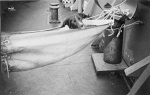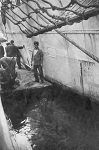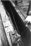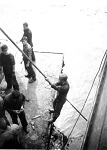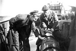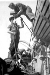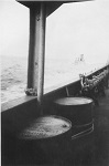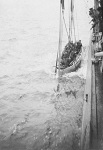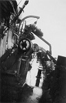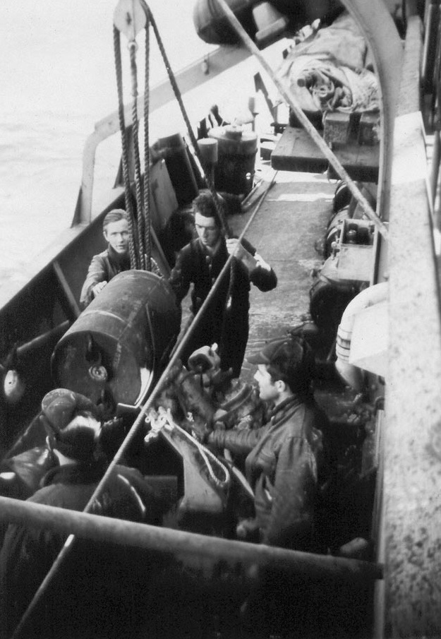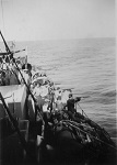 (DD173) Depth charge rails manned during Actions Stations on HMCS OWEN SOUND K340 (DD174) Depth charge exploding astern of HMCS OWEN SOUND K340 (DD175) Depth charge thrower manned during actions stations on HMCS OWEN SOUND K340. Written on back of photo by Dan Dunbar "Taken during action stations on the depth charges. This is the one next to mine." (DD176) "Ossie and I repairing the falls for the D/C" on HMCS OWEN SOUND K340 (DD177) A couple unknown sailors on HMCS OWEN SOUNDS K340 have a lot of fun with some rope work