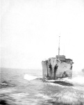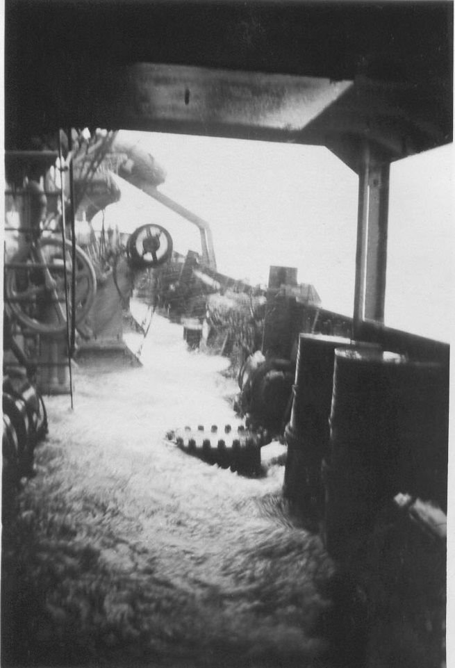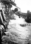 (DD65-DD69) HMCS OWEN SOUND K340 shipping seas over her port side. Photo looking aft towards quarter deck