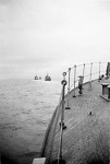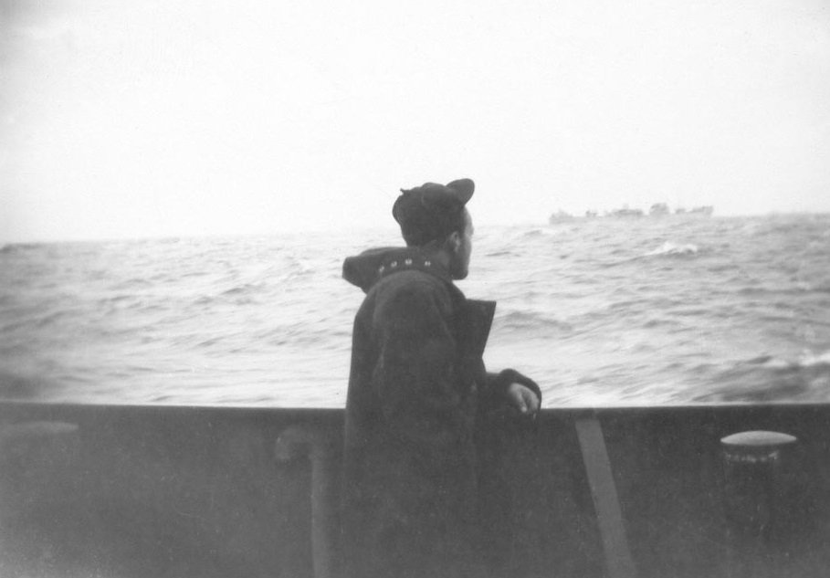 (DD99-DD103) Merchant ships in convoy (DD101) Sailor on HMCS OWEN SOUND K340 looking out at the ships in convoy