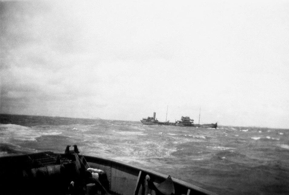 (DD104) Unknown merchant ship off the port bow of HMCS OWEN SOUND K340 seen from the after gun tub (DD105) Unknown merchant ship close off the starboard bow of HMCS OWEN SOUND K340 (DD106) Unknown merchant ship astern of HMCS OWEN SOUND K340 (DD107-DD109) Merchant ships in convoy