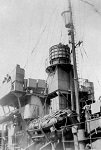 (DD178) Bridge area of HMCS OWEN SOUND K340. There is a signalman on the light on the port bridge wing. The circular structure just ahead of the mast is the radar. Due to the look of the protective covering on it, it was called the lantern. (DD179) A couple sailors working on the gun deck of HMCS OWEN SOUND K340. Note the MF/DF antenna mounted on the bridge behind the gun (DD180)