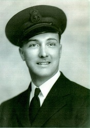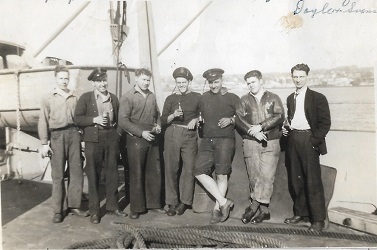 (GW01) Portrait of CPO George Meron (GW02) L-R: Stoker Delgatty, E.A. Machlean, Stoker Bell, Gibs, CPO Meron, Stoker Doyle and Stoker Svendsen on HMCS LAYMORE. Wilf's pants were rolled up for the photo by request.