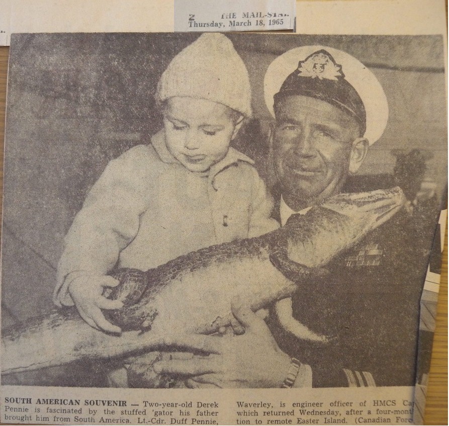 (DP01) LCdr Duff Pennie (left) supervising the tot issue on HMCS CAPE SCOTT (DP02) Photo taken on 15 Feb 1965 when HMCS CAPE SCOTT flew the new Canadian flag for the first time. On the left is Dr. Stanley Skornya, Director METEI; Dr Helen Reid, Medical Examination (Paediatrics); and LCdr(E) Duff Pennie, Engineering Officer (DP03) LCdr Pennie give his son a stuffed alligator on his return from the METEI deployment