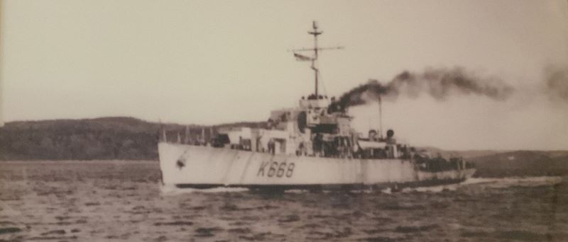 HMCS LA HULLOISE K668 conducting engine trials on the Kennebecasis River off Rothesay, NB 04 Oct 1945. John Brock and his father C. H. Brock were onboard for the trials.