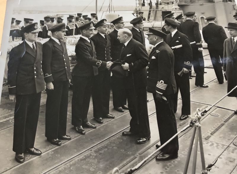 SLt Panner Brock shaking hands with Prime Minister Mackenzie King on board HMCS ASSINIBOINE I18
