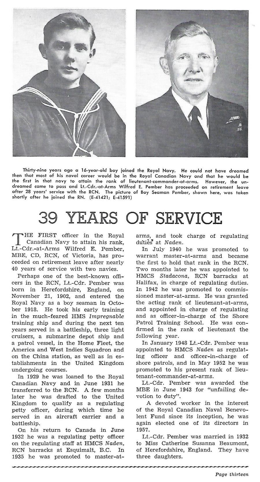 "This Warrant Officer has carried out the arduous duties of Warrant Master-at-Arms in HMCS Stadacona with zeal, loyalty and cheerfulness. He has, at all times displayed tact, and has made a very great contribution to the discipline of the Royal Canadian Navy"