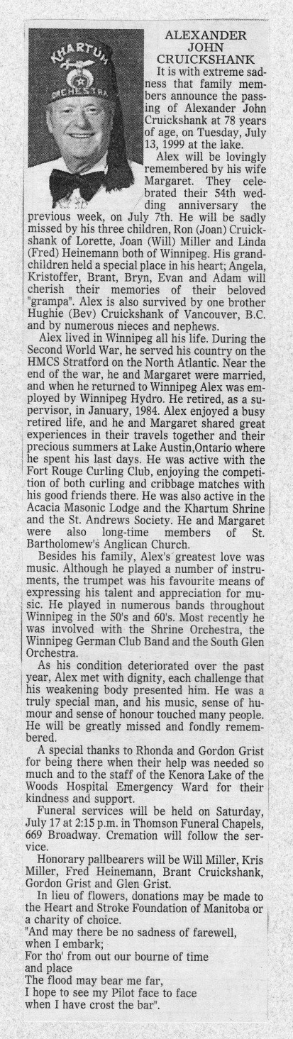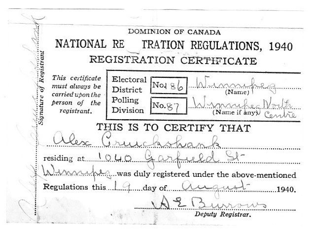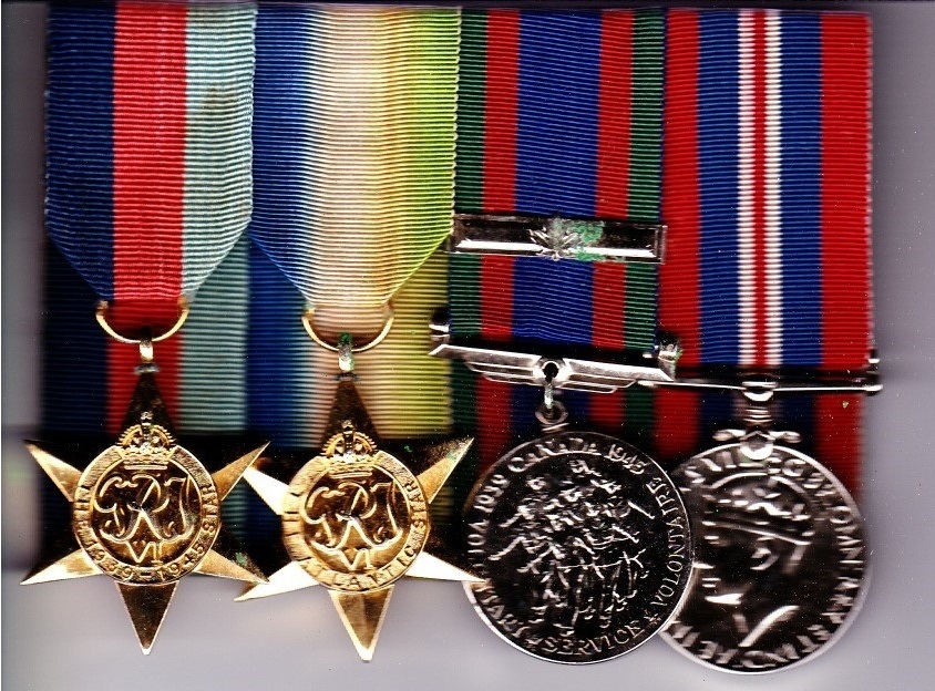 (AC01) Alex's medals - the 1939-45 Star, the Atlantic Star, the Canadian Volunteer Service Medal with bar, the War Medal 1939-45 (AC2) Alex's uniform (AC03) National Registration Regulation 1940 Registration Certificate (AC04) Passing Certificate - Educational Test for Advancement to Petty Officer (AC05) Statement of Account