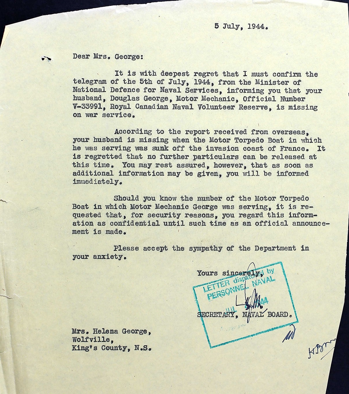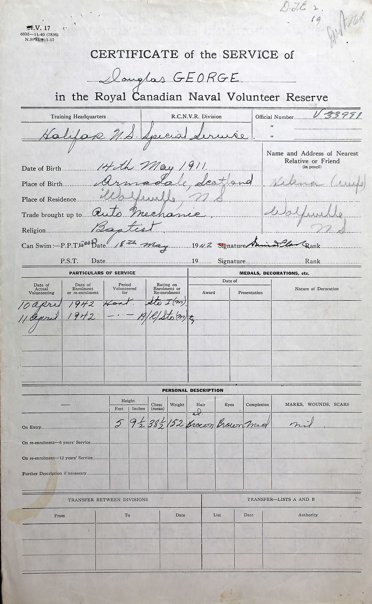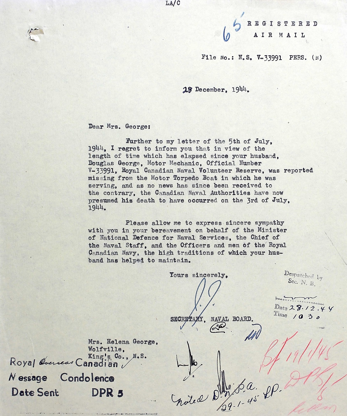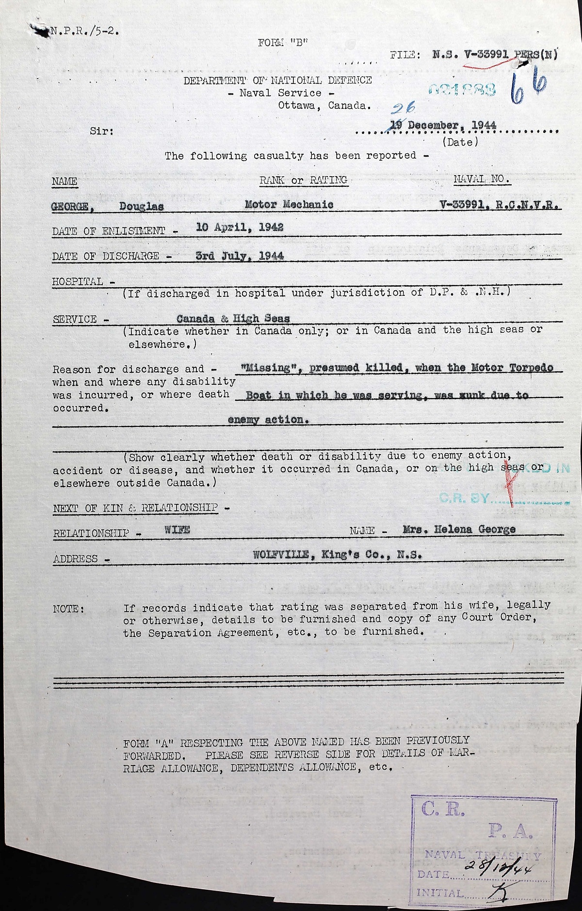 GEORGE, Douglas, PO M.M., V33991, RCNVR, MPK - 03 Jul 1944, MTB-460 - Son of Charles R. and Margaret George; husband of Helena Josephine George, of Halifax, Nova Scotia.