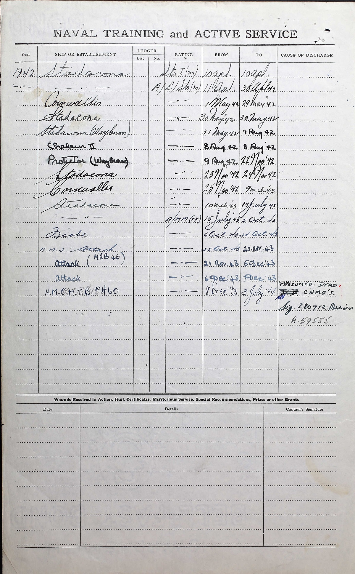 Ships served in: HMCS STADACONA (Depot ship) - Enlisted 10 Apr 1942. Commenced Active Service 11 Apr 1942 HMCS WEYBURN - Served in WEYBURN 31 May 1942 - 22 Nov 1942 HMS WOLFE (Depot Ship) - Served in WOLFE 21 Nov 1943 - 05 Dec 1943 MTB 460 - Drafted to MTB 460 08 Dec 1943 as an A/MM, RCNVR