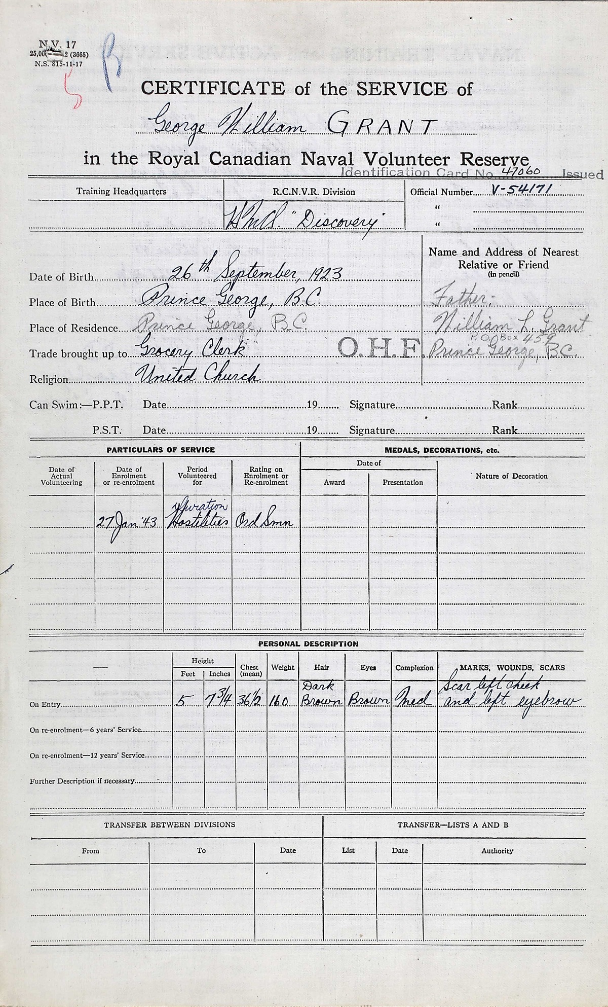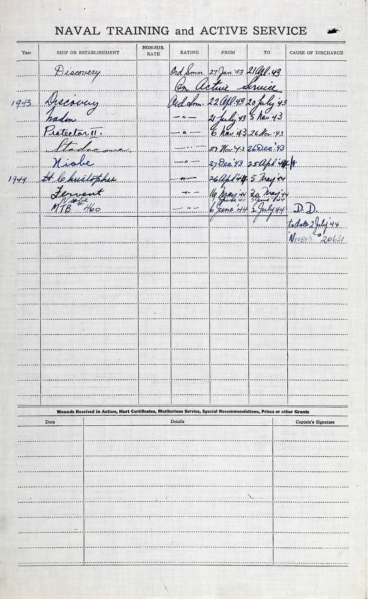 Ships served in: HMCS DISCOVERY - Enlisted 27 Jan 1943. Commenced Active Service 22 Apr 1943 MTB 460 - Drafted to MTB 460 06 Jun 1944 as an OS, RCNVR
