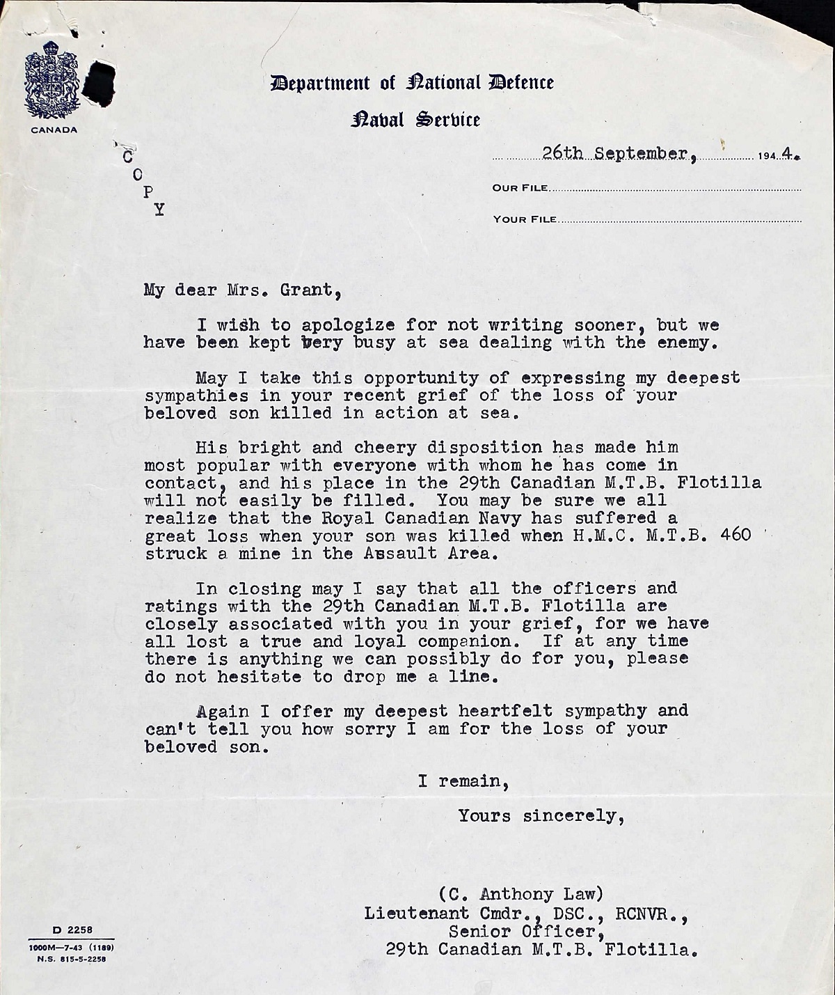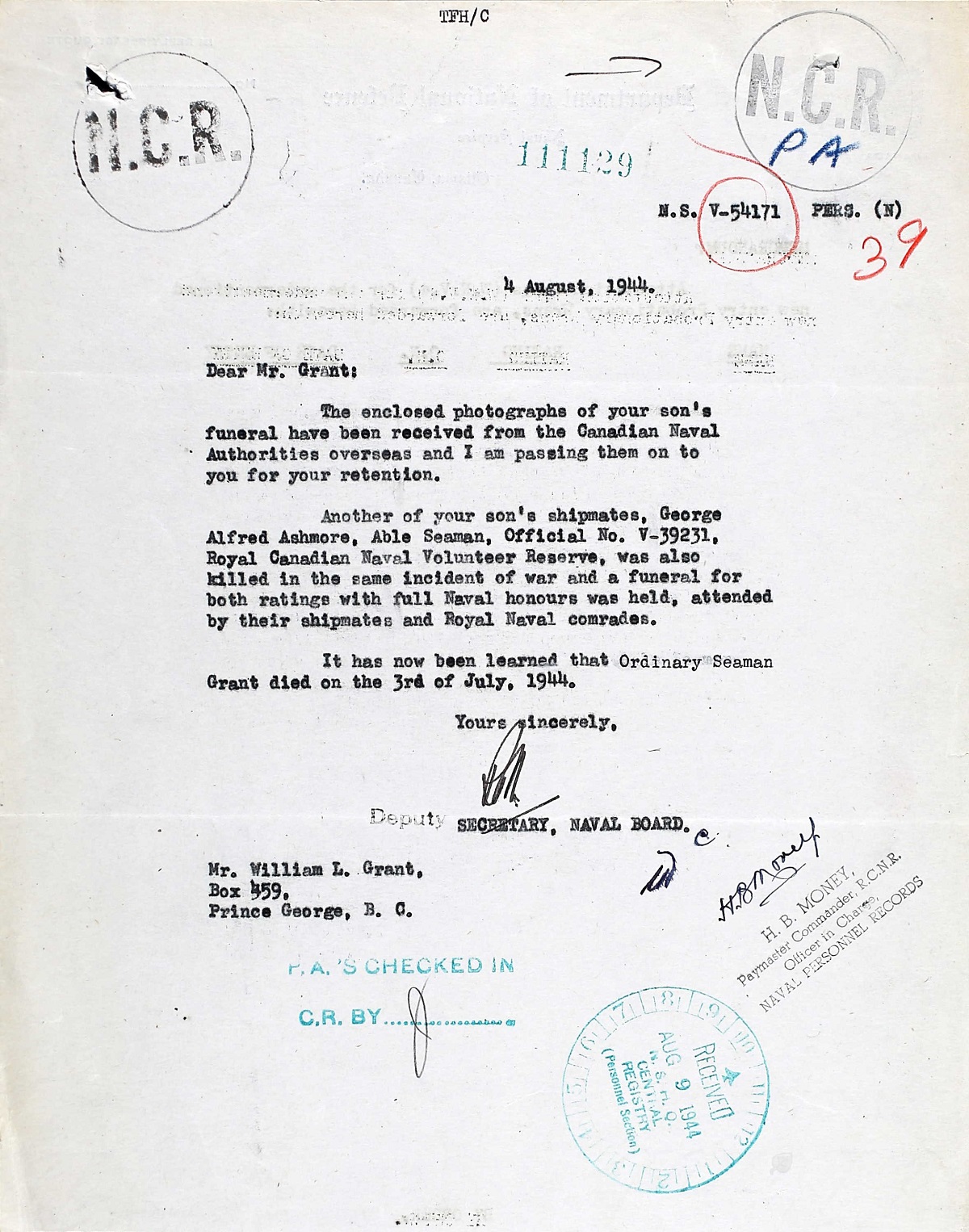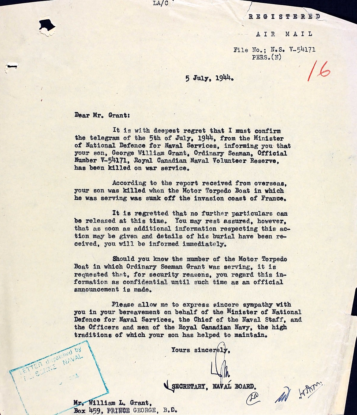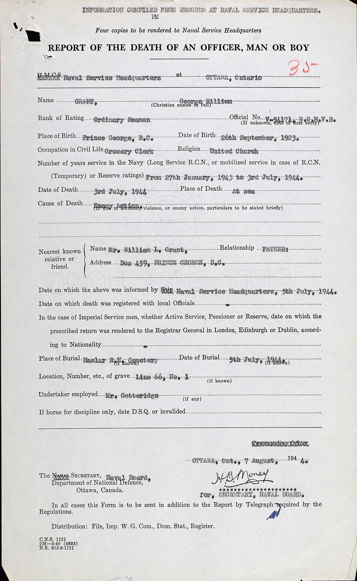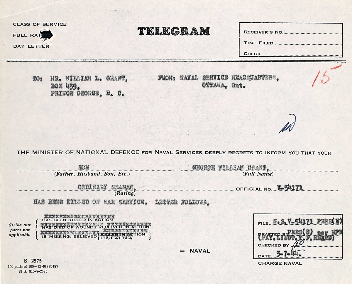 GRANT, George OS, V54171, RCNVR, killed - 02 Jul 1944, MTB-460 - Son of Mr. and Mrs. William A. Grant, of Prince George, British Columbia.