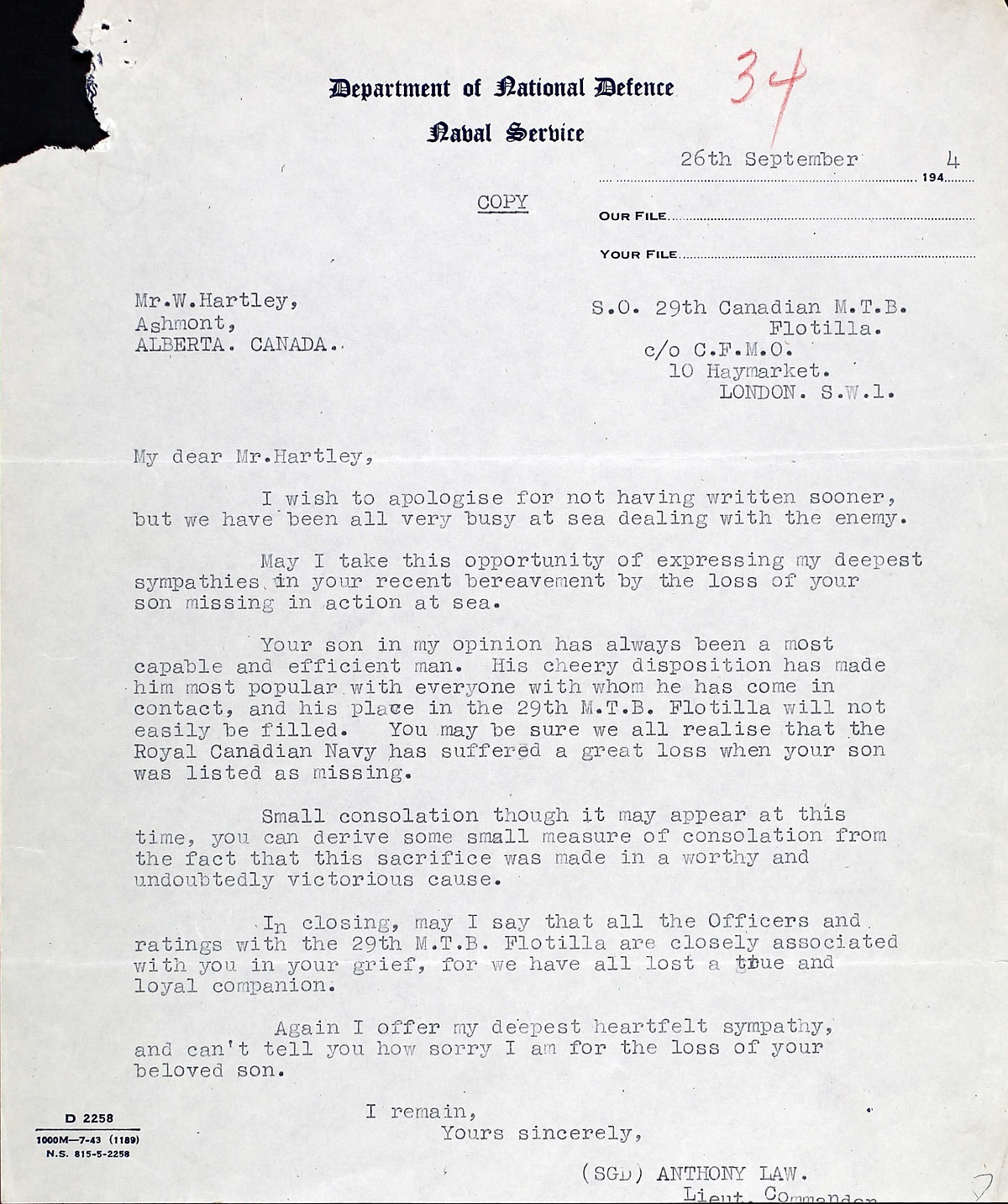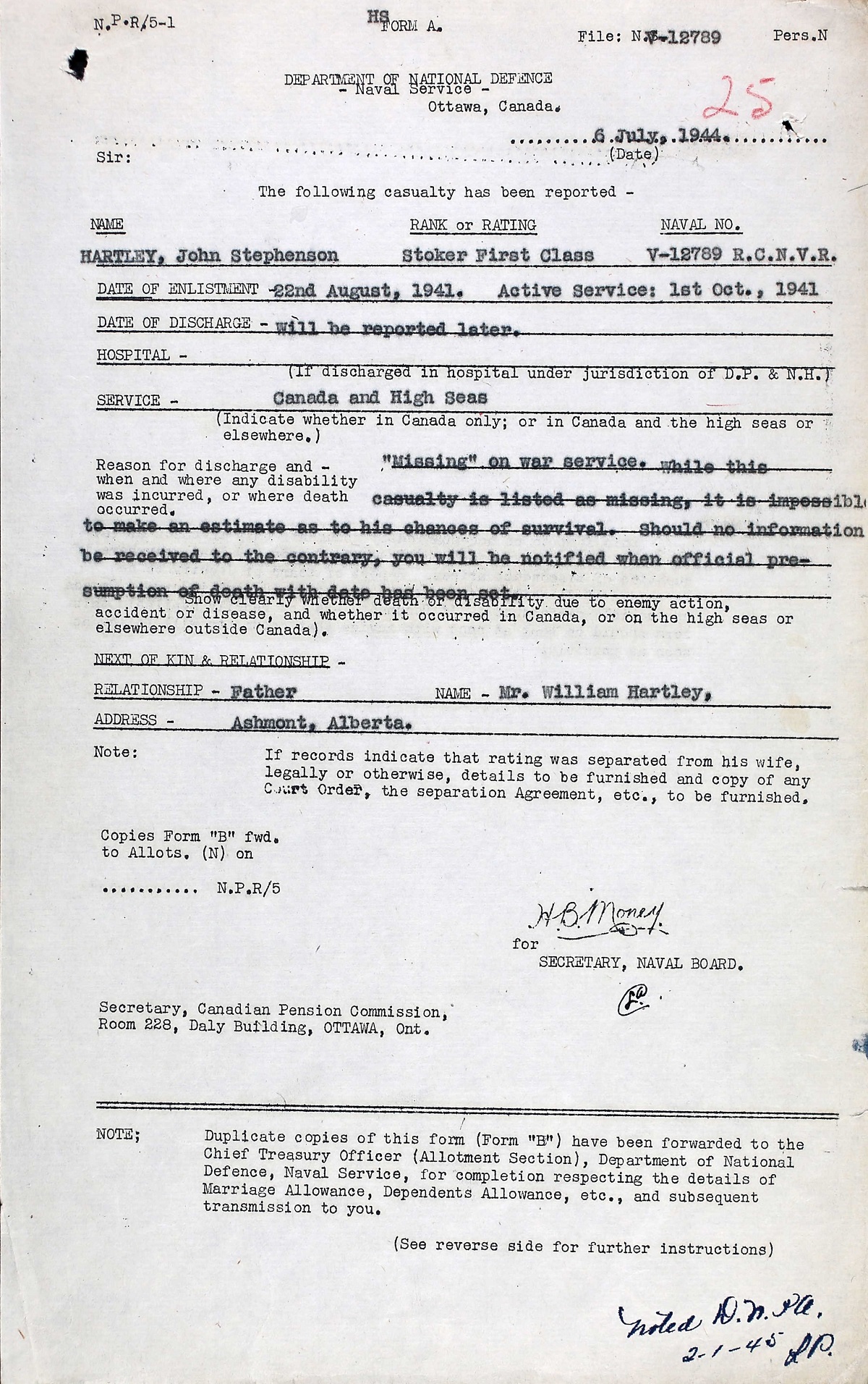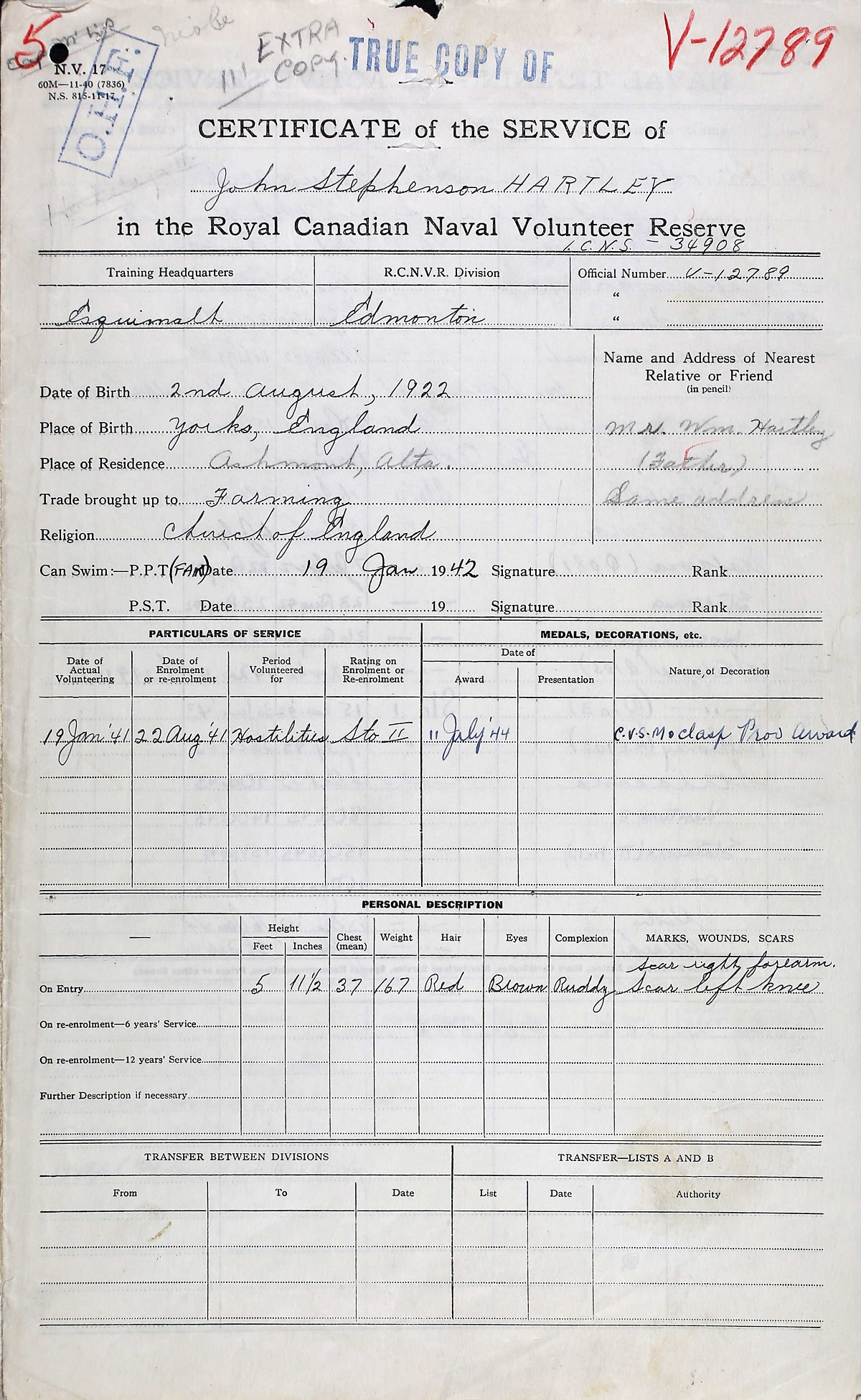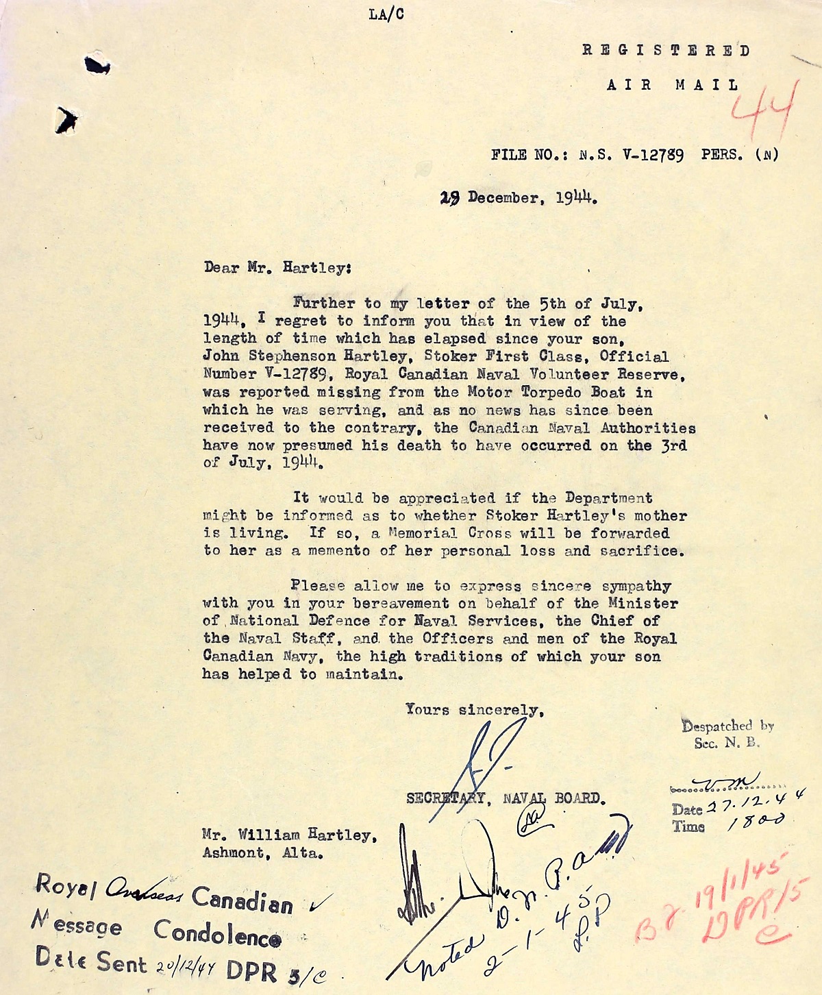 HARTLEY, John Stephenson, Sto 1c, V12789, RCNVR, MPK - 03 Jul 1944, MTB-460 - Son of William Hartley, of Ashmont, Alberta.