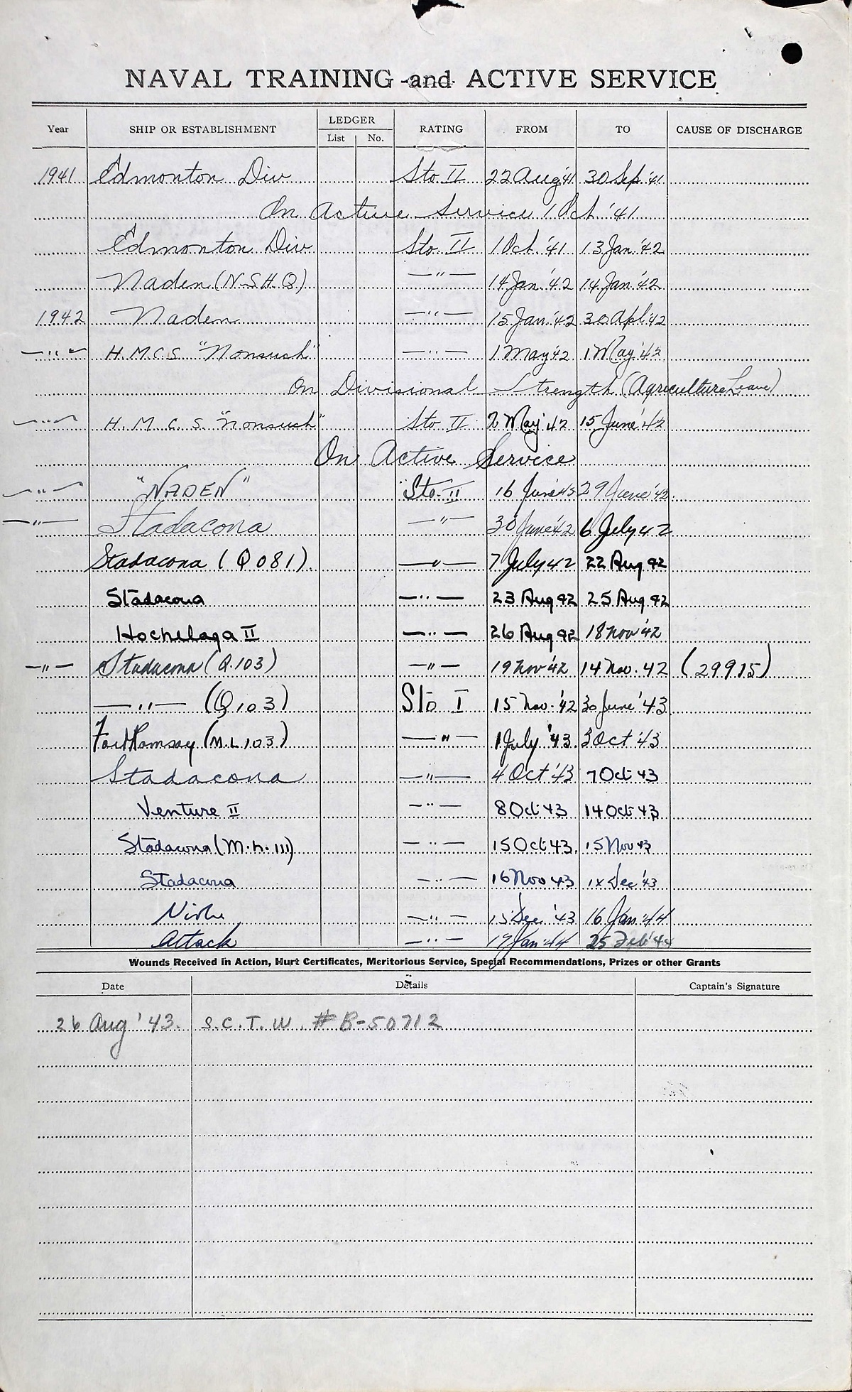 EDMONTON DIVISION RCNVR - Enlisted 22 Aug 1941 as a Sto 2c, RCNVR. Commenced Active Service 01 Dec 1941