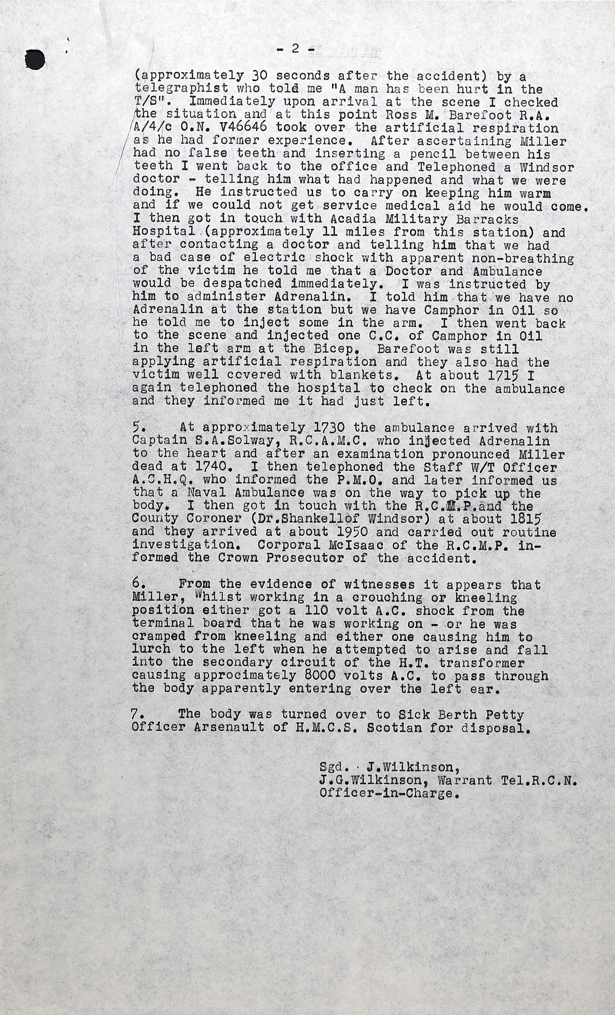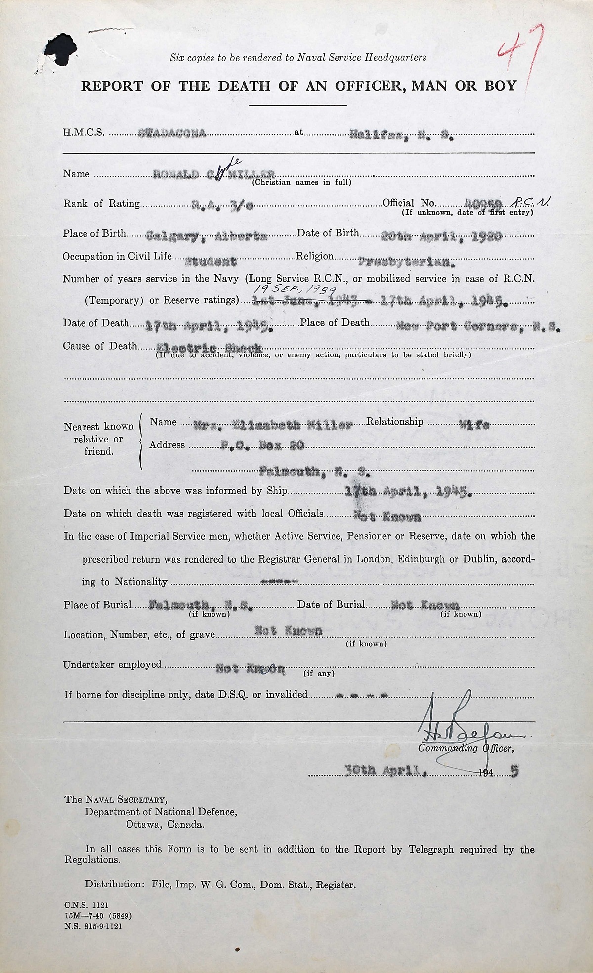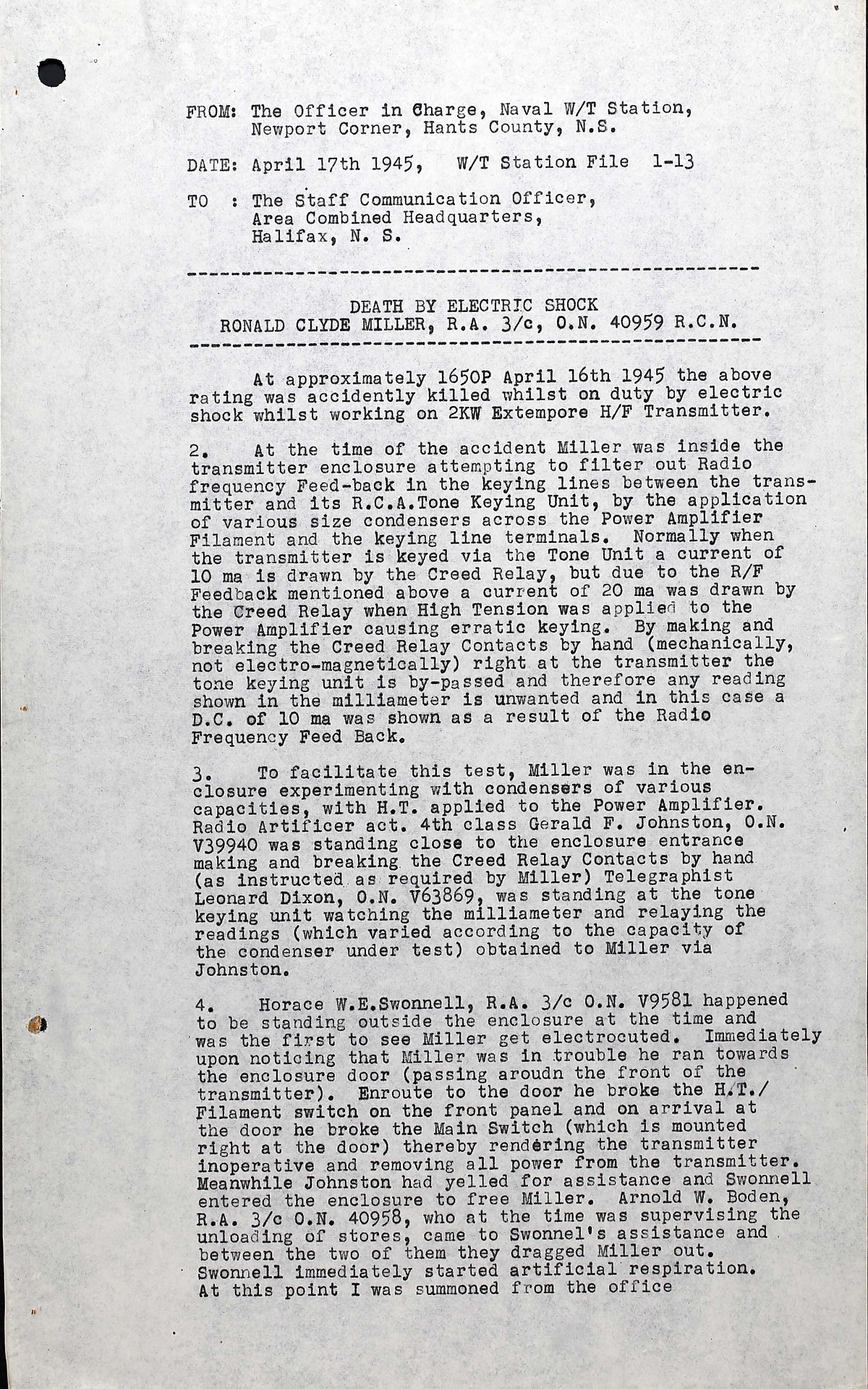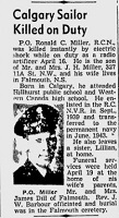 Artificer 3rd Class Ronald Clyde Miller transferred from the R.C.N.V.R. to the Royal Canadian Navy on 01 Jun 1943. Artificer 3rd Class Ronald Clyde Miller was working at the navy's transmitter site in Newport Corners and was killed as a result of an electric shock. He is buried in the Falmouth Cemetery, Centre Falmouth, NS