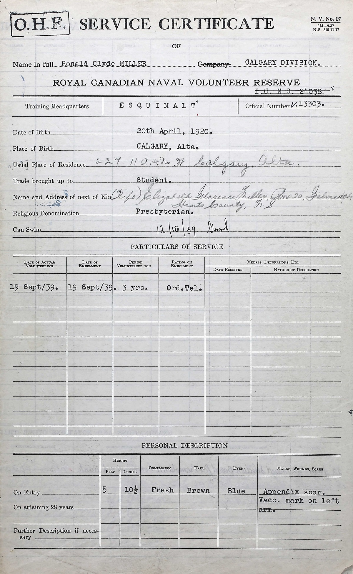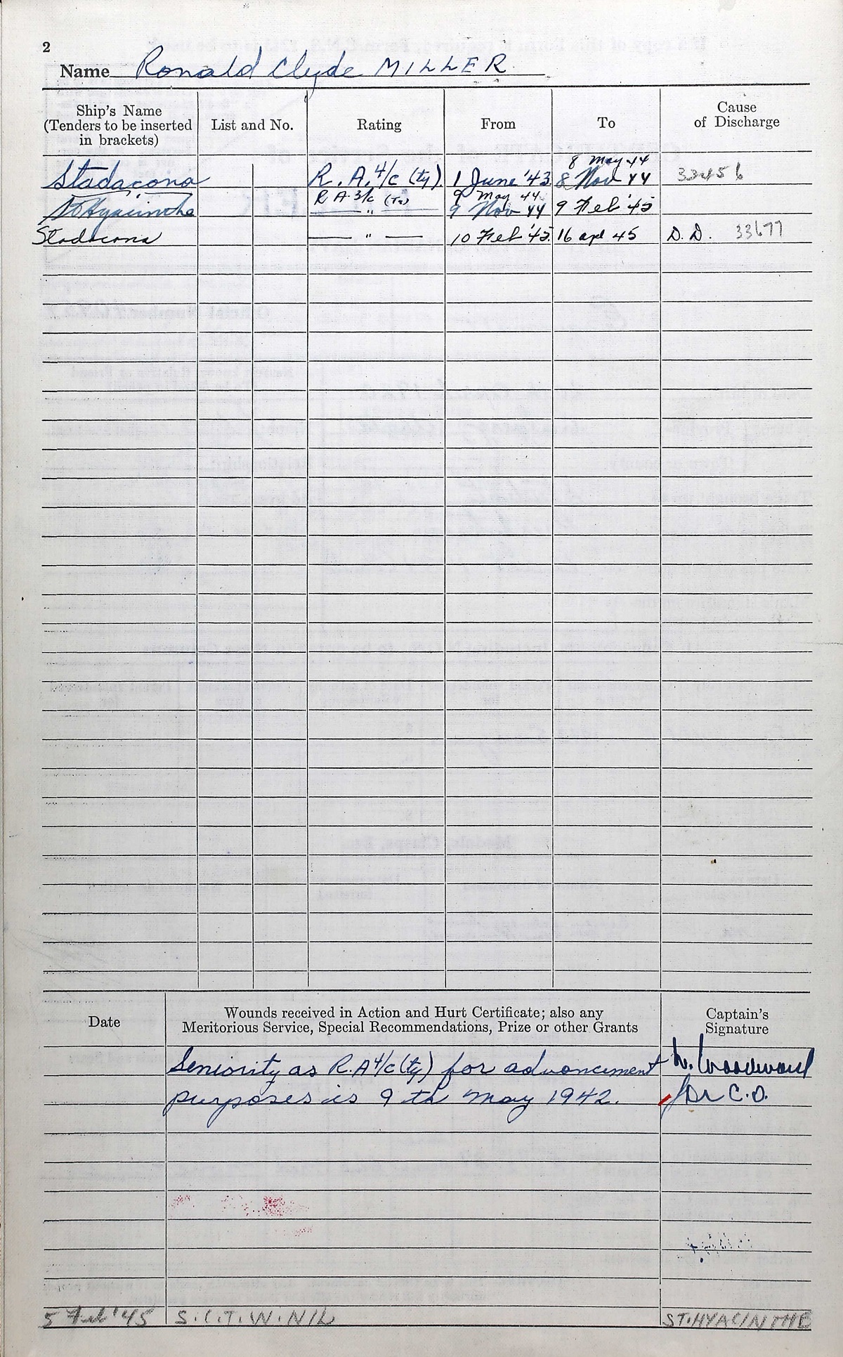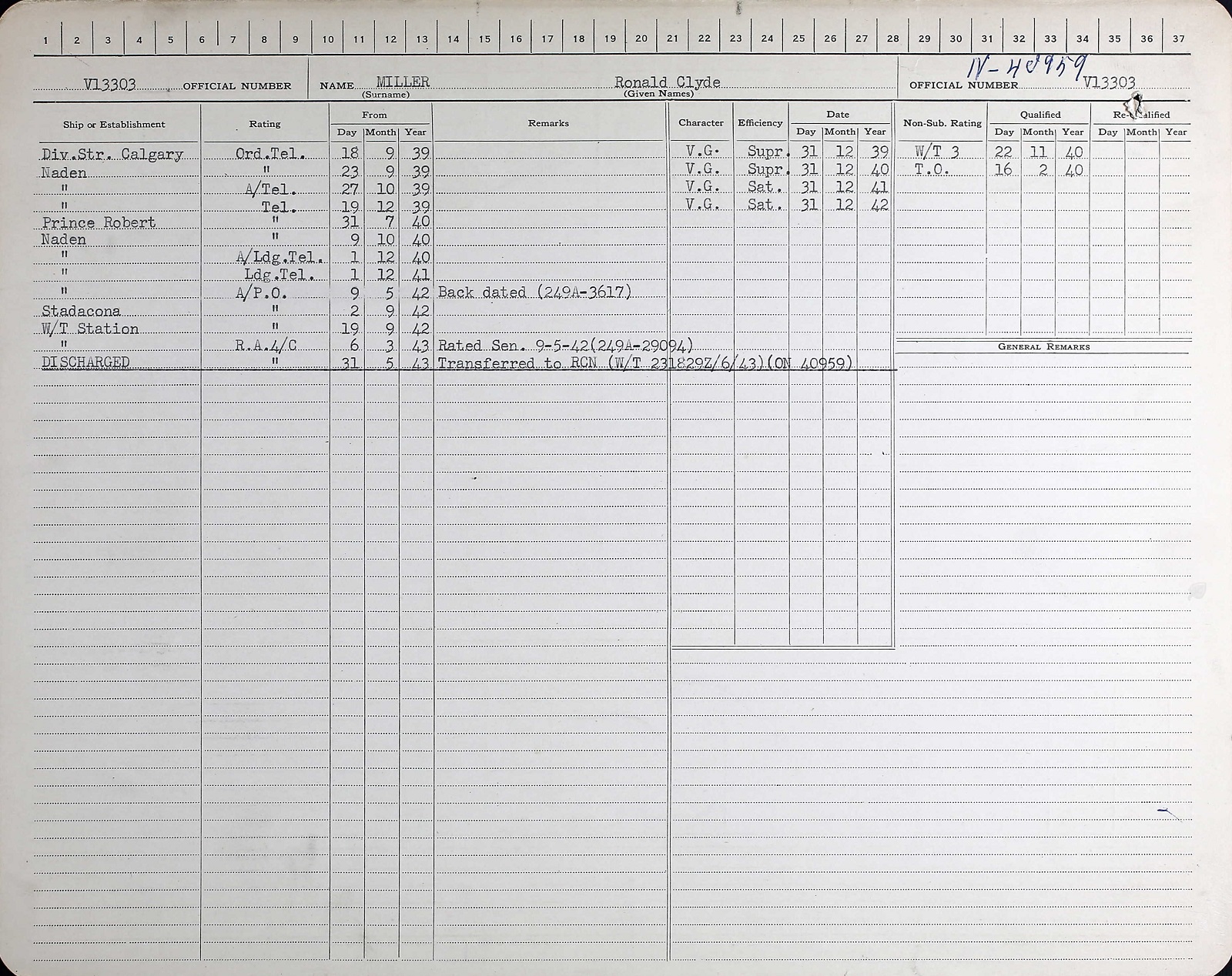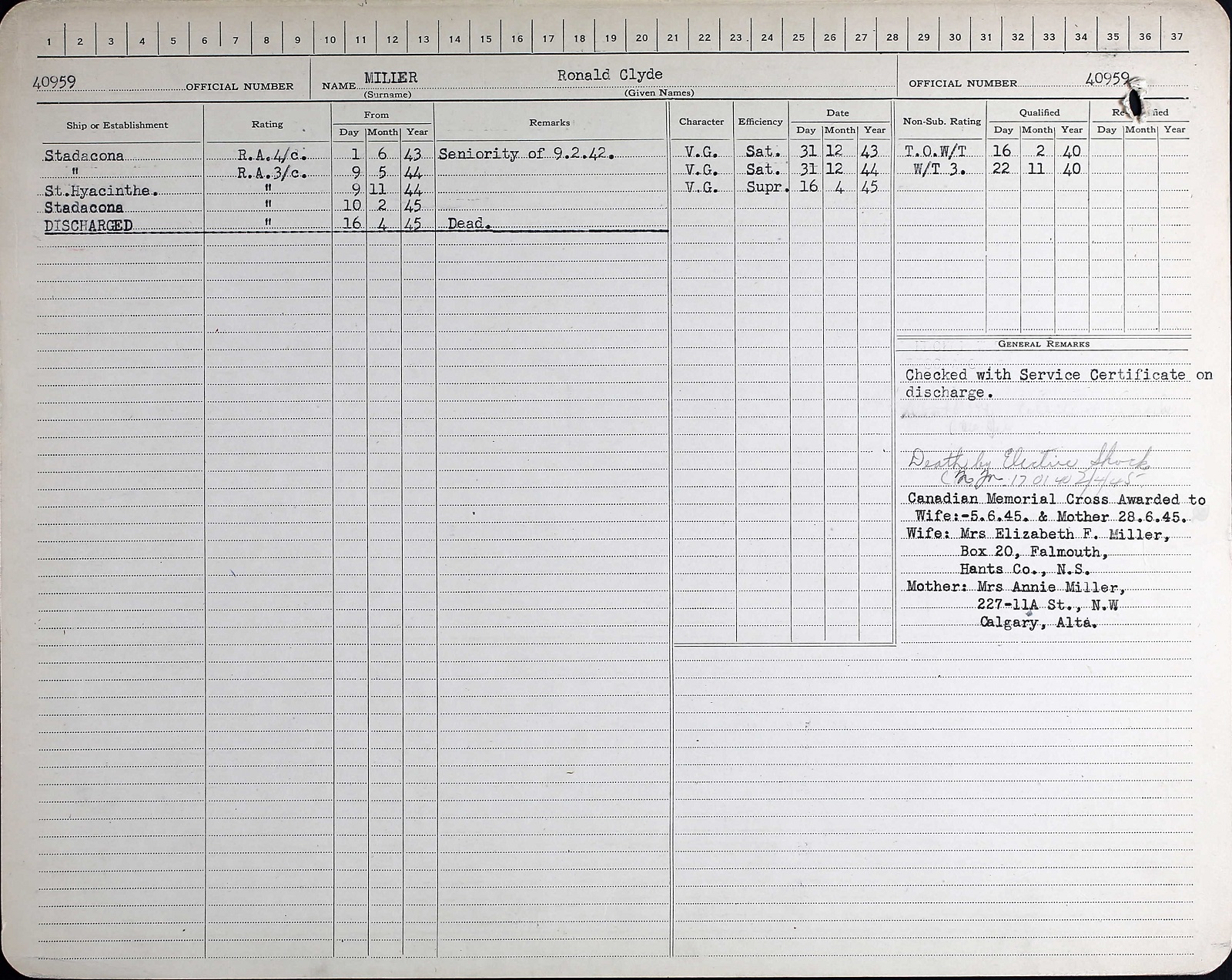 Ships served in: RCNVR DIVISION CALGARY - Enlisted 19 Sep 1939 HMCS PRINCE ROBERT - Served in PRINCE ROBERT 31 Jul 1940 - 08 Oct 1940 as a Tel, RCNVR HMCS STADACONA (Depot ship for) NAVAL W/T STATION, Newport Corner, NS - Drafted to W/T Station 19 Sep 1942 as an A/PO Tel (M), RCNVR * Transferred to the RCN 01 Jun 1943 HMCS STADACONA (Depot ship) - Recorded on the books of STADACONA 01 Jun 1943 - 08 Nov 1944 as an RA 4c and RA3c, RCN. Rated RA 3c 09 May 1944. HMCS ST HYACINTHE - Served in ST HYACINTHE 09 Nov 1944 - 09 Feb 1945 as an RA 3c, RCN HMCS STADACONA (Depot ship) - Records on the books of STADACONA 10 Feb 1945 - 16 Apr 1945 as an RA 3c, RCN * While it is not recorded on his RCN Certificate of Service, RA Miller was employed at the Naval W/T Station, Newport Corner, NS at the time of his death.