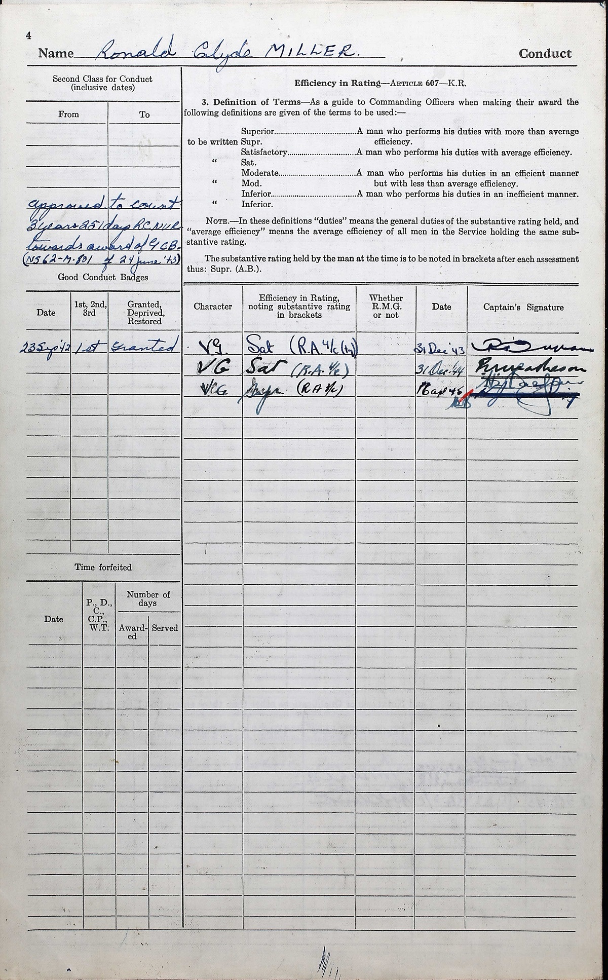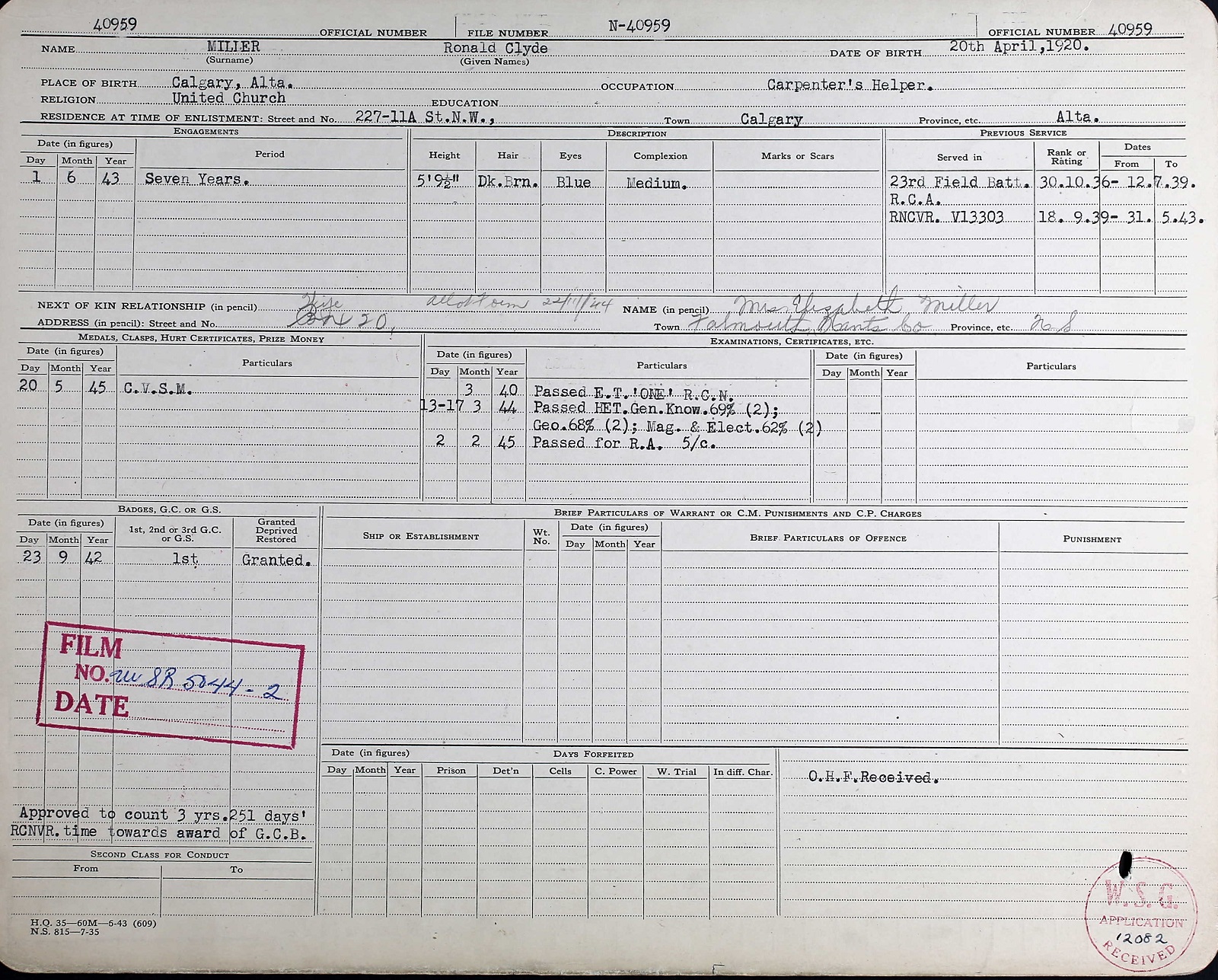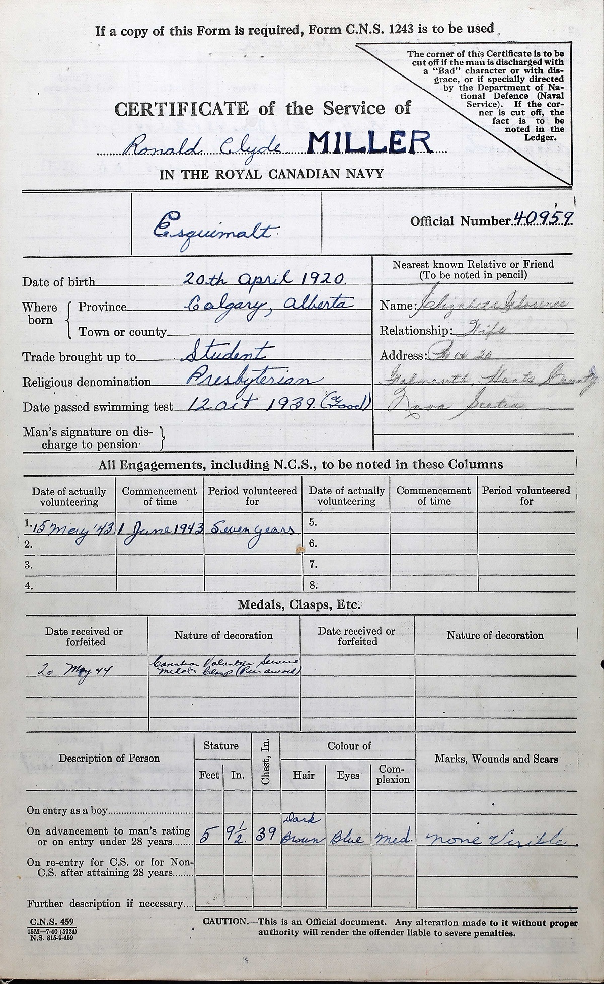 Ships served in: RCNVR DIVISION CALGARY - Enlisted 19 Sep 1939 HMCS PRINCE ROBERT - Served in PRINCE ROBERT 31 Jul 1940 - 08 Oct 1940 as a Tel, RCNVR HMCS STADACONA (Depot ship for) NAVAL W/T STATION, Newport Corner, NS - Drafted to W/T Station 19 Sep 1942 as an A/PO Tel (M), RCNVR * Transferred to the RCN 01 Jun 1943 HMCS STADACONA (Depot ship) - Recorded on the books of STADACONA 01 Jun 1943 - 08 Nov 1944 as an RA 4c and RA3c, RCN. Rated RA 3c 09 May 1944. HMCS ST HYACINTHE - Served in ST HYACINTHE 09 Nov 1944 - 09 Feb 1945 as an RA 3c, RCN HMCS STADACONA (Depot ship) - Records on the books of STADACONA 10 Feb 1945 - 16 Apr 1945 as an RA 3c, RCN * While it is not recorded on his RCN Certificate of Service, RA Miller was employed at the Naval W/T Station, Newport Corner, NS at the time of his death.