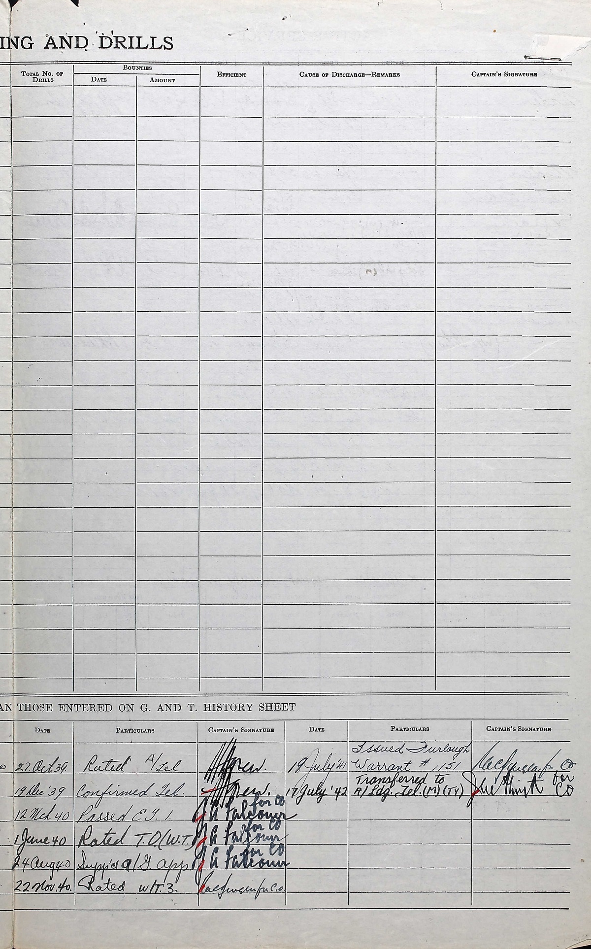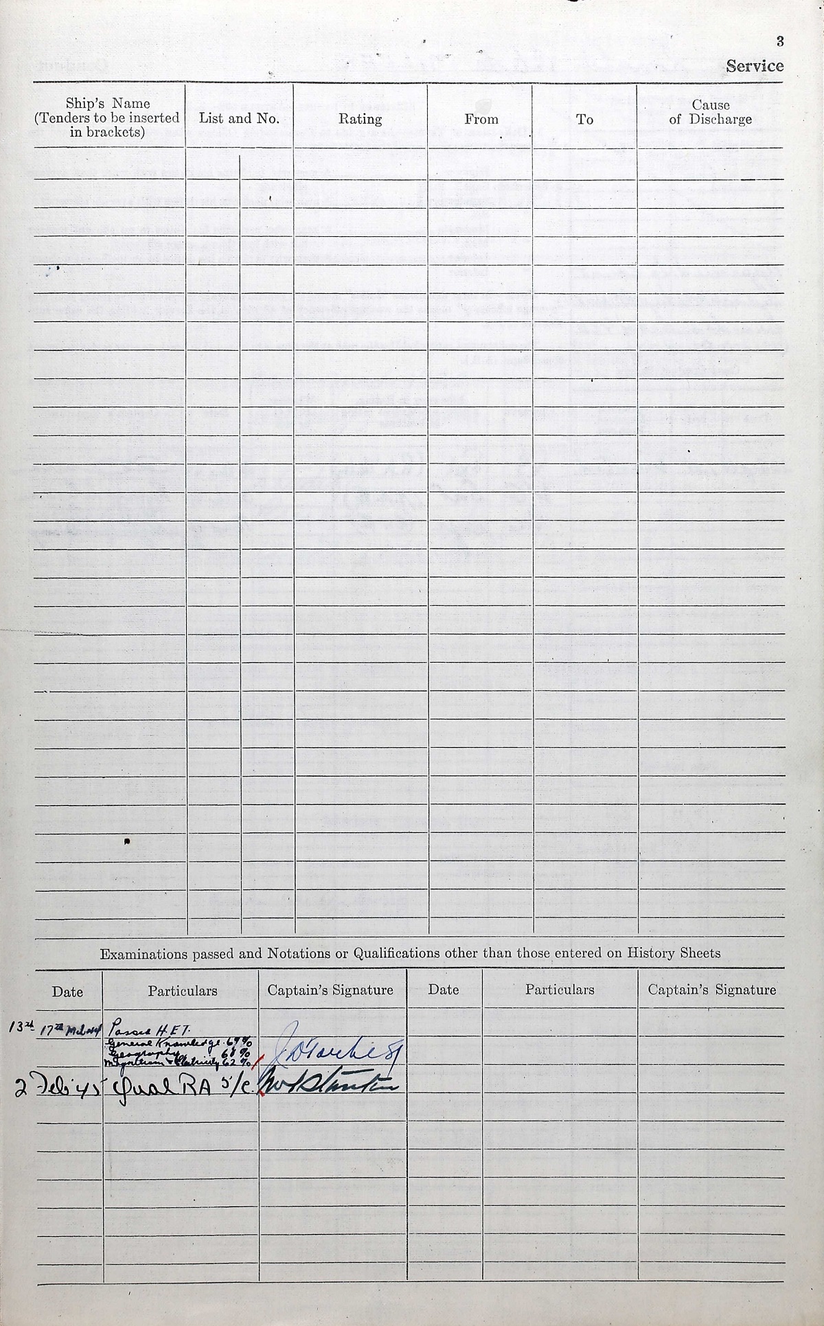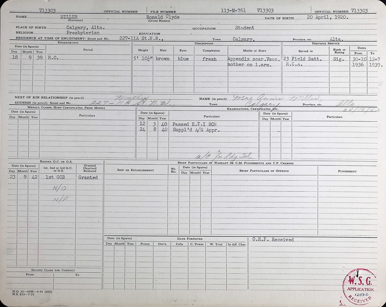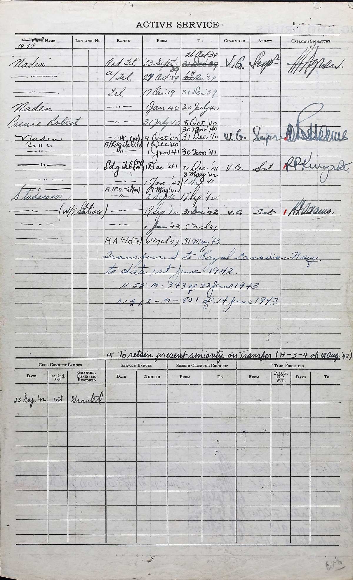 Ships served in: RCNVR DIVISION CALGARY - Enlisted 19 Sep 1939 HMCS PRINCE ROBERT - Served in PRINCE ROBERT 31 Jul 1940 - 08 Oct 1940 as a Tel, RCNVR HMCS STADACONA (Depot ship for) NAVAL W/T STATION, Newport Corner, NS - Drafted to W/T Station 19 Sep 1942 as an A/PO Tel (M), RCNVR * Transferred to the RCN 01 Jun 1943 HMCS STADACONA (Depot ship) - Recorded on the books of STADACONA 01 Jun 1943 - 08 Nov 1944 as an RA 4c and RA3c, RCN. Rated RA 3c 09 May 1944. HMCS ST HYACINTHE - Served in ST HYACINTHE 09 Nov 1944 - 09 Feb 1945 as an RA 3c, RCN HMCS STADACONA (Depot ship) - Records on the books of STADACONA 10 Feb 1945 - 16 Apr 1945 as an RA 3c, RCN * While it is not recorded on his RCN Certificate of Service, RA Miller was employed at the Naval W/T Station, Newport Corner, NS at the time of his death.
