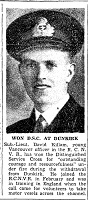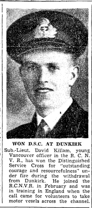 Citation for Award of DSC: KILLAM, David Allison, Sub-Lieutenant, Distinguished Service Cross (DSC) - Awarded as per London Gazette of 2 August 1940. "For courage and resource in withdrawal of troops in neighbourhood of Le Havre."