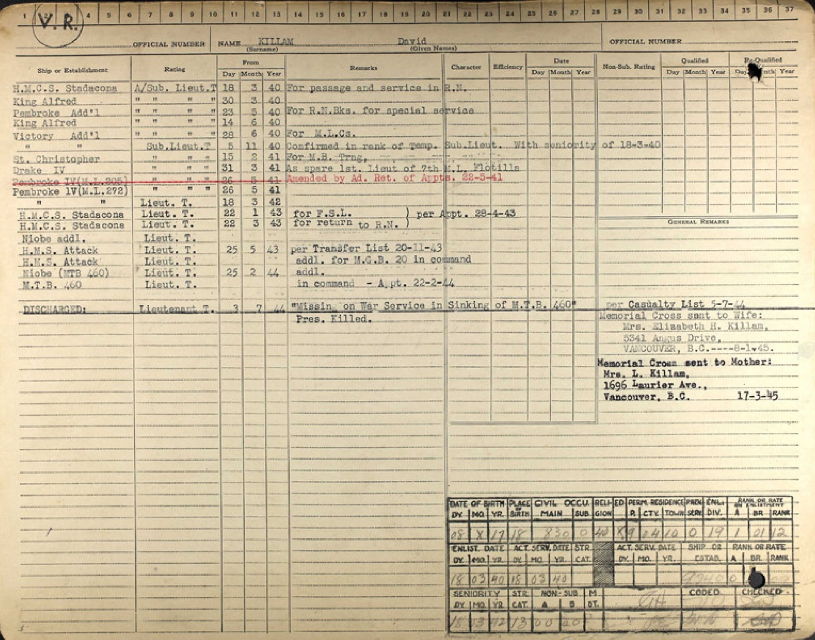 Ships served in: * Enlisted 18 Mar 1940 ML 272 (Royal Navy Motor Launch) - Served in ML-272 26 May 1941 - 21 Jan 1943. MTB-460 - Appointed to MTB-460 25 Feb 1944 as a Lt, RCNVR, Commanding Officer