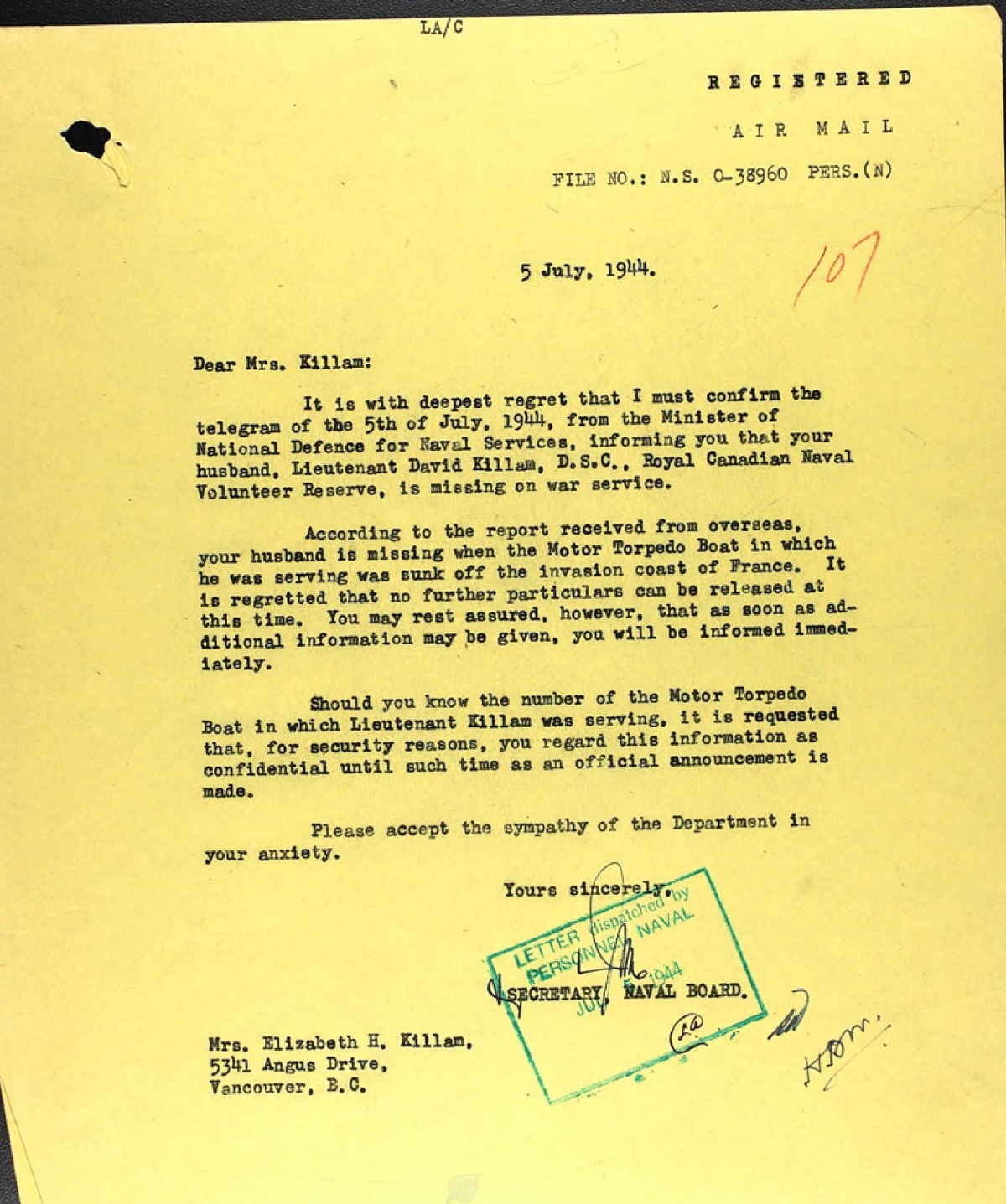 Lieutenant D. A. Killam was reported missing, presumed killed when his boat HMC MTB 460 (motor torpedo boat) was lost. He was last seen clinging to a gas tank bobbing in the English Channel while other members of his crew were being picked up by another MTB. Despite a 90 minute search by the MTB the rescues saw no further glimpse of Lieutenant Killam or of the eight other men listed as missing as a result of the explosion.