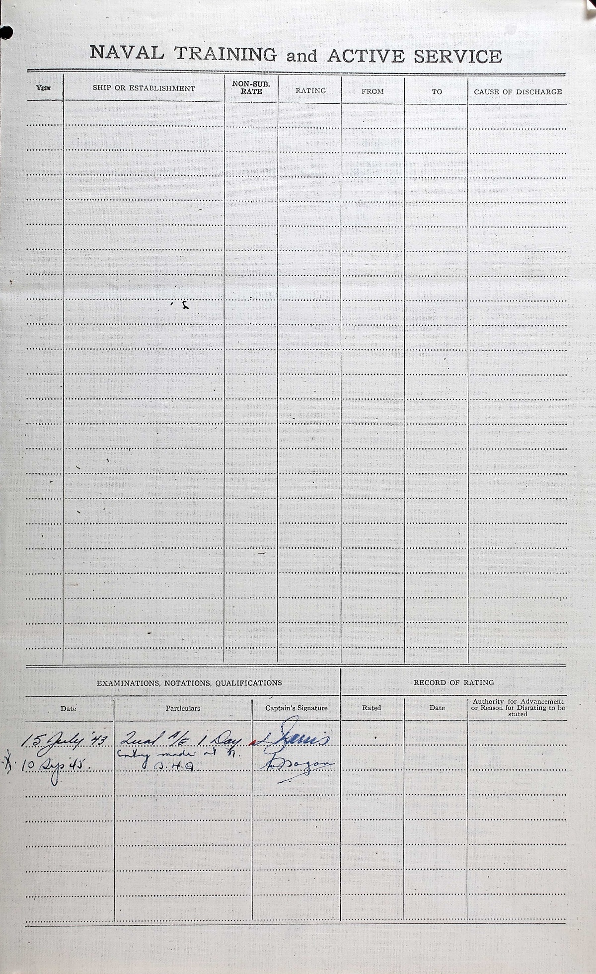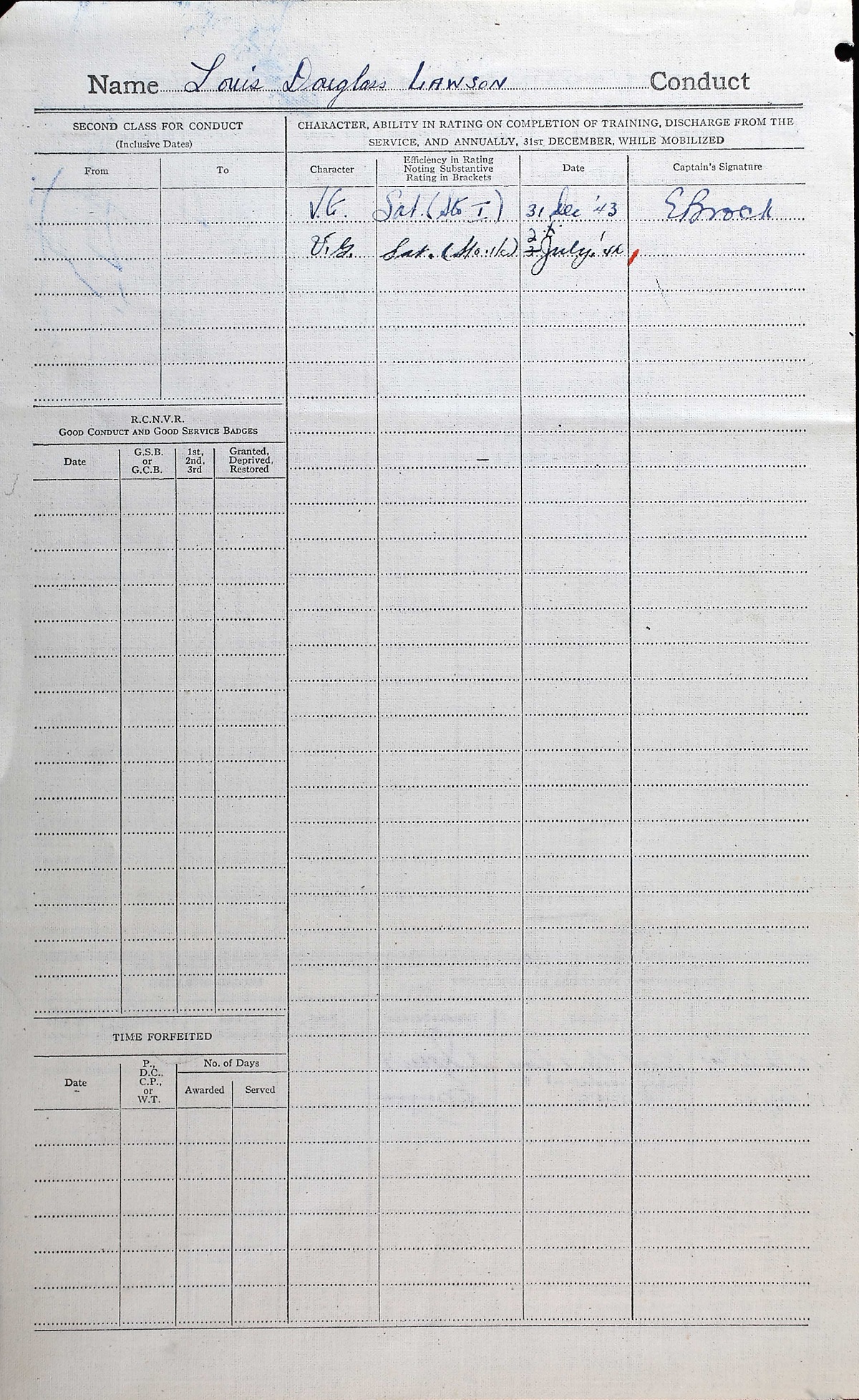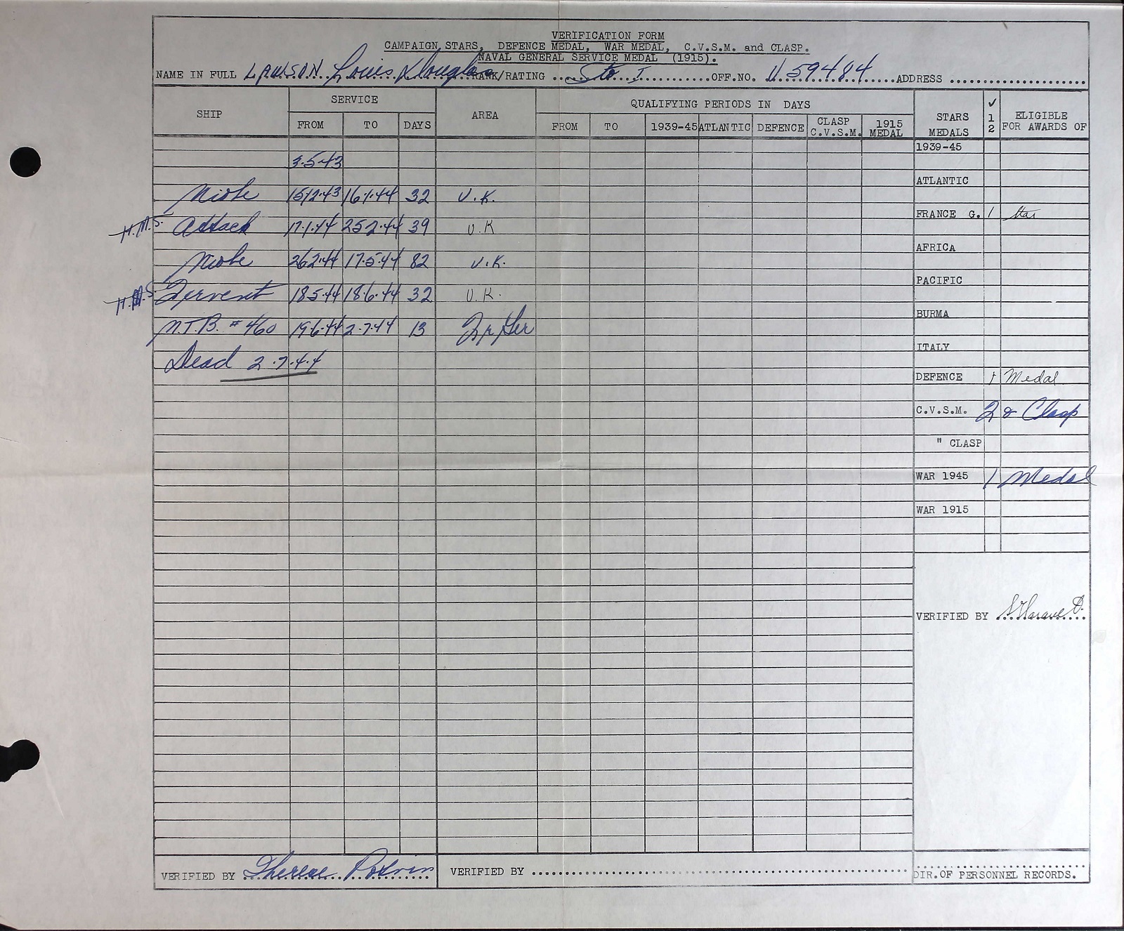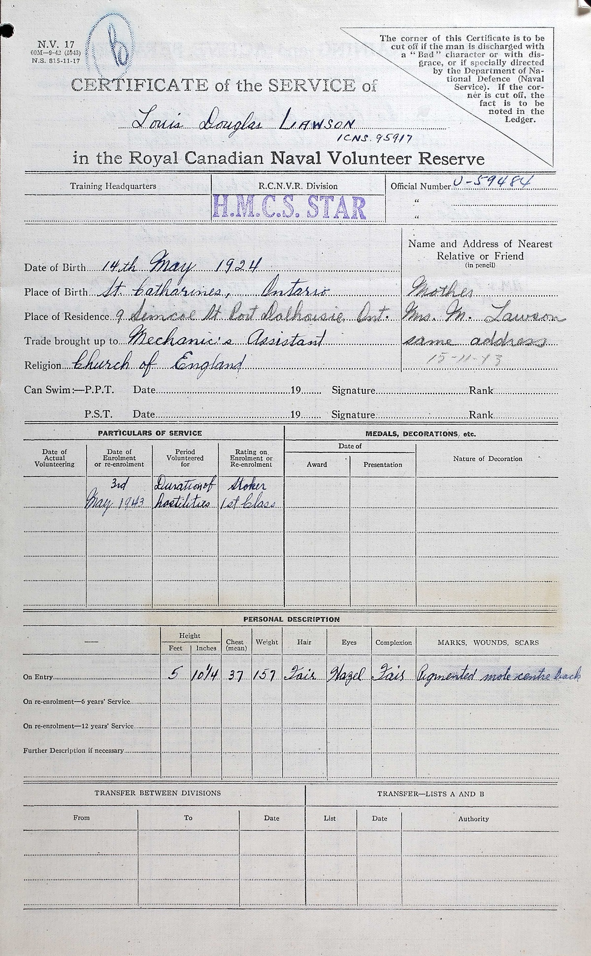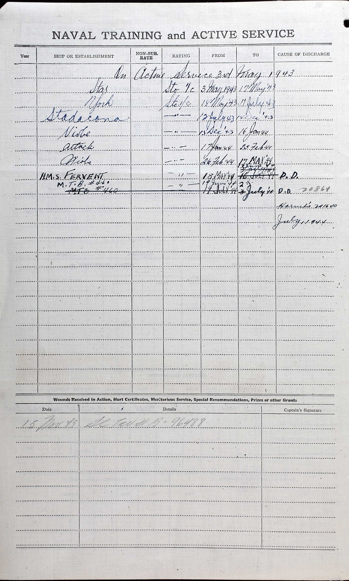 Ships served in: HMCS STAR - Enlisted and commenced Active Service on 03 May 1943 HMCS YORK - Served in YORK 17 May 1932 - 14 Jul 1943 MTB-460 - Drafted to MTB-460 19 Jun 1944 as a Sto 1c, RCNVR