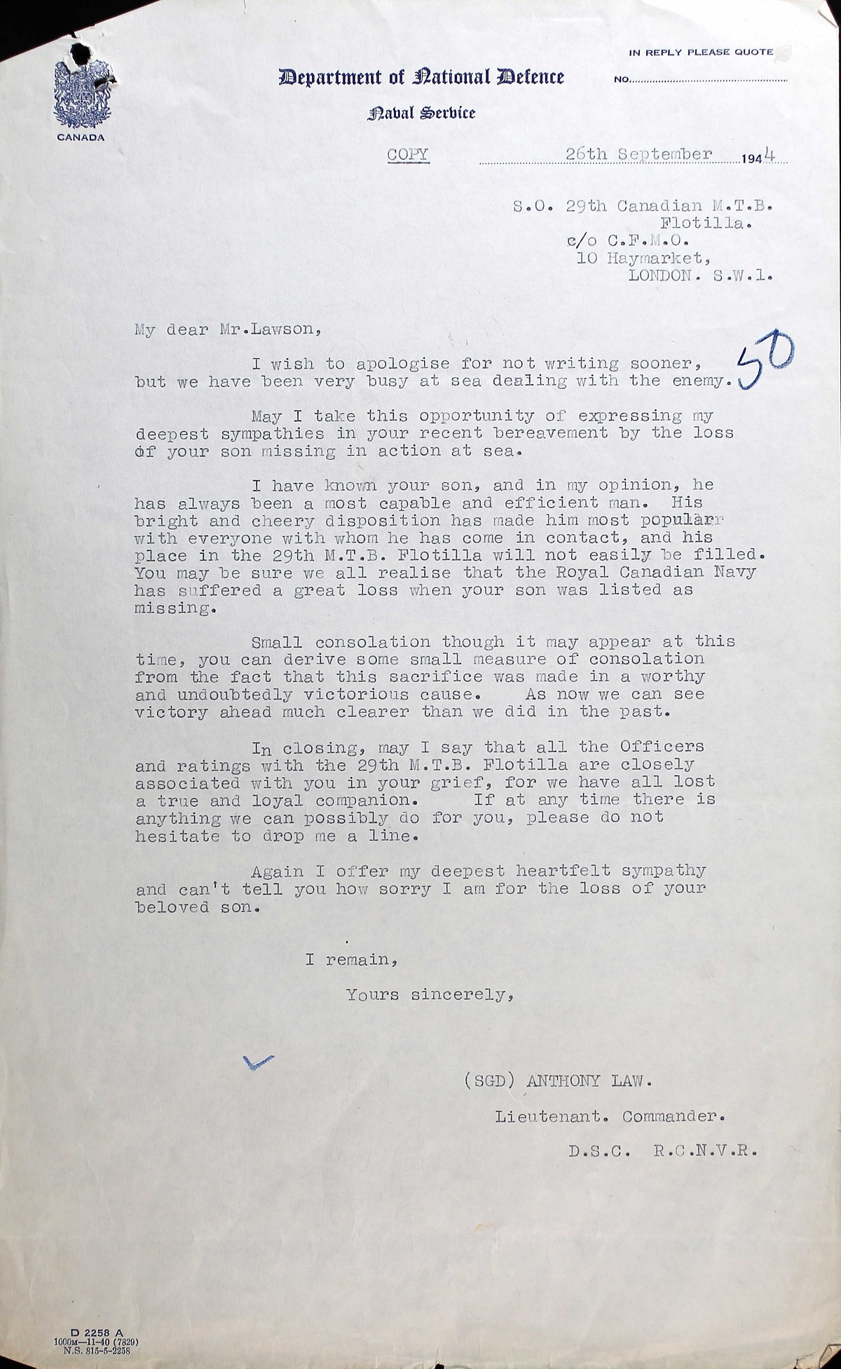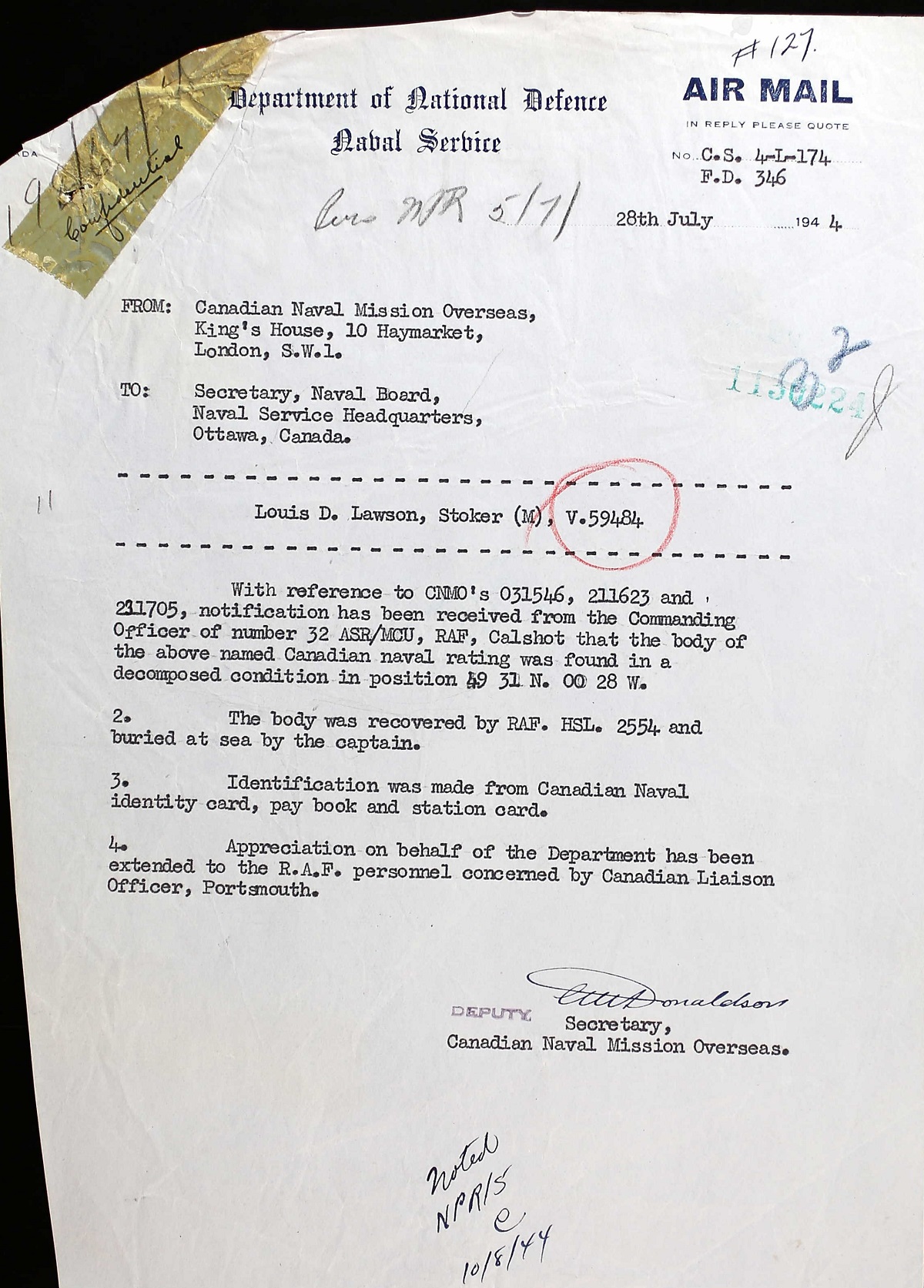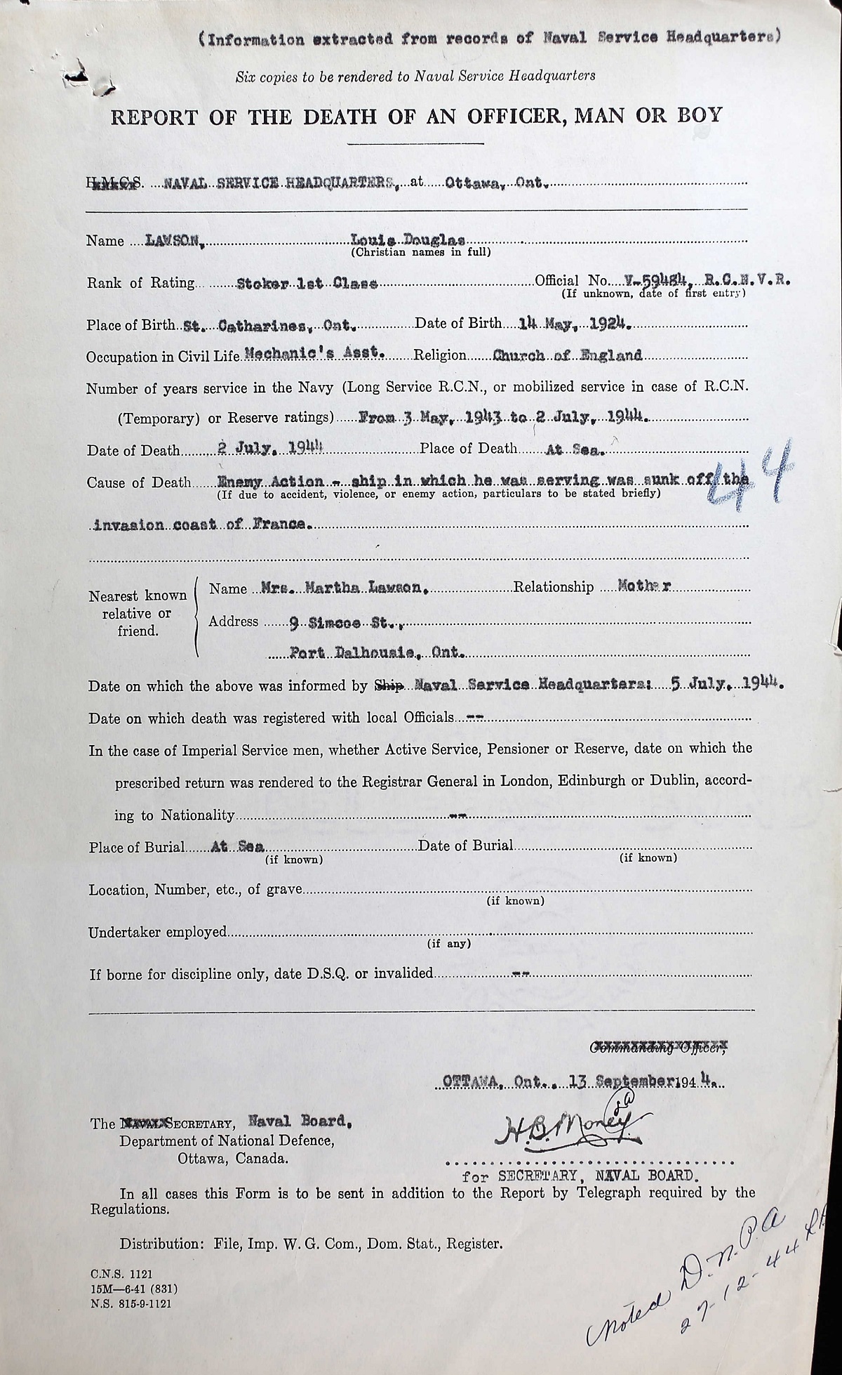 LAWSON, Louis Douglas, Sto 1c, V59484, RCNVR, killed - 03 Jul 1944, MTB-460 - Son of Thomas Franklin Lawson and Martha S. Lawson, of Port Dalhousie, Ontario.