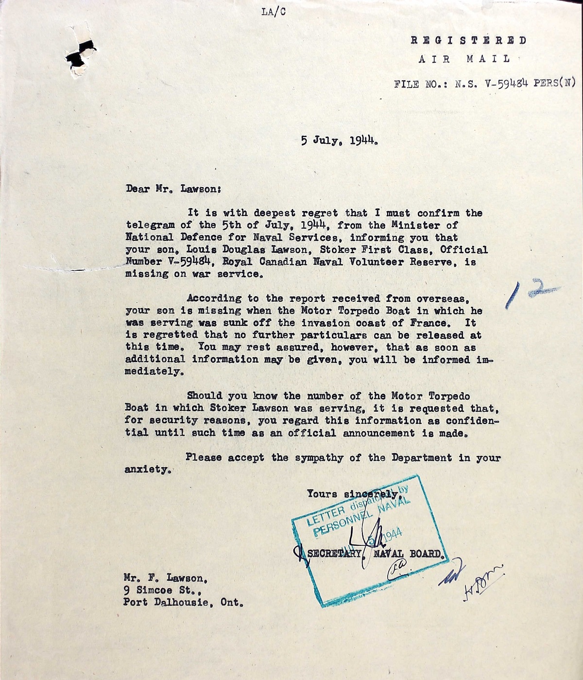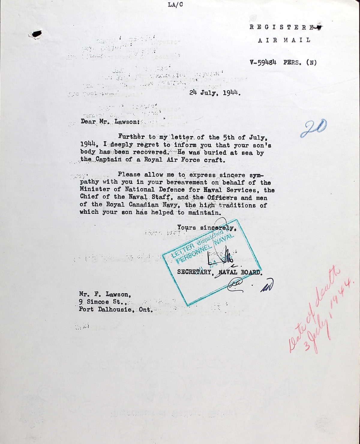 (LL06-LL08) Letters to Stoker Lawson's father (LL09) Letter on the recovery of the body of Stoker Lawson and his burial at sea (LL008) Medal verification form
