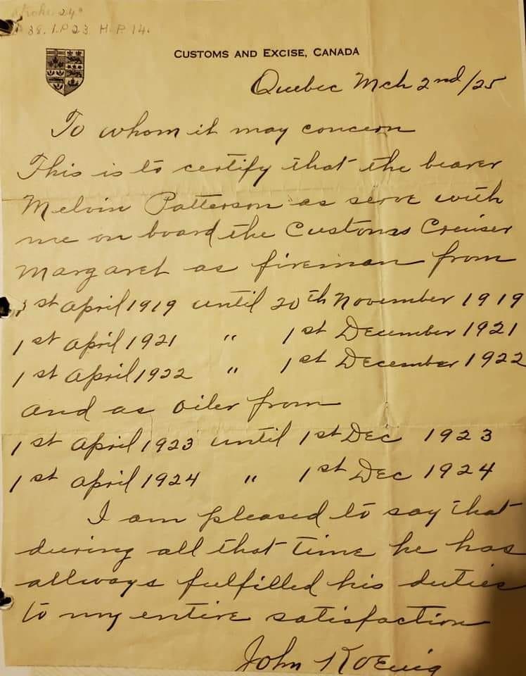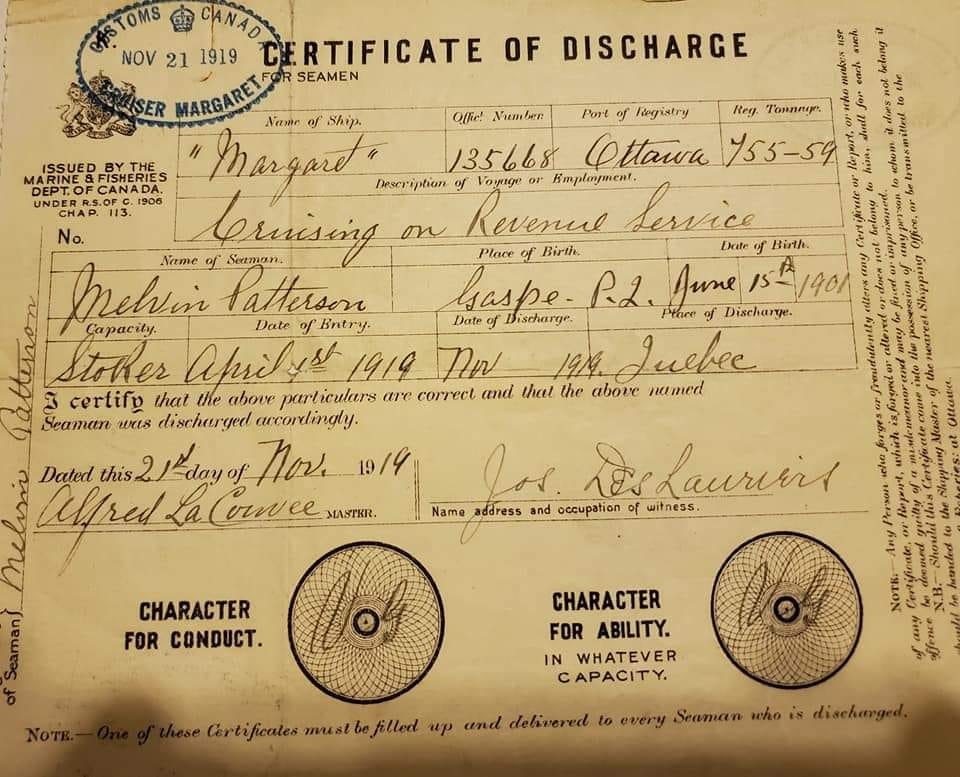 (MP07) Melvin Patterson - Identity and Service Certificate dated 16 Apr 1920 (MP08) Melvin Patterson, Certificate of Discharge, CGS MARGARET dated 21 Nov 1918 (MP09) Merchant Seaman documentation to enter / leave USA. Dated 22 Mar 1920, Port of Philadelphia, USA (MP10) Melvin Patterson, Certificate of Discharge, CGS MARGARET dated 30 Nov 1922 (MP11) Letter of Recommendation / confirmation of employment for Melvin Patterson for his service in MARGARET