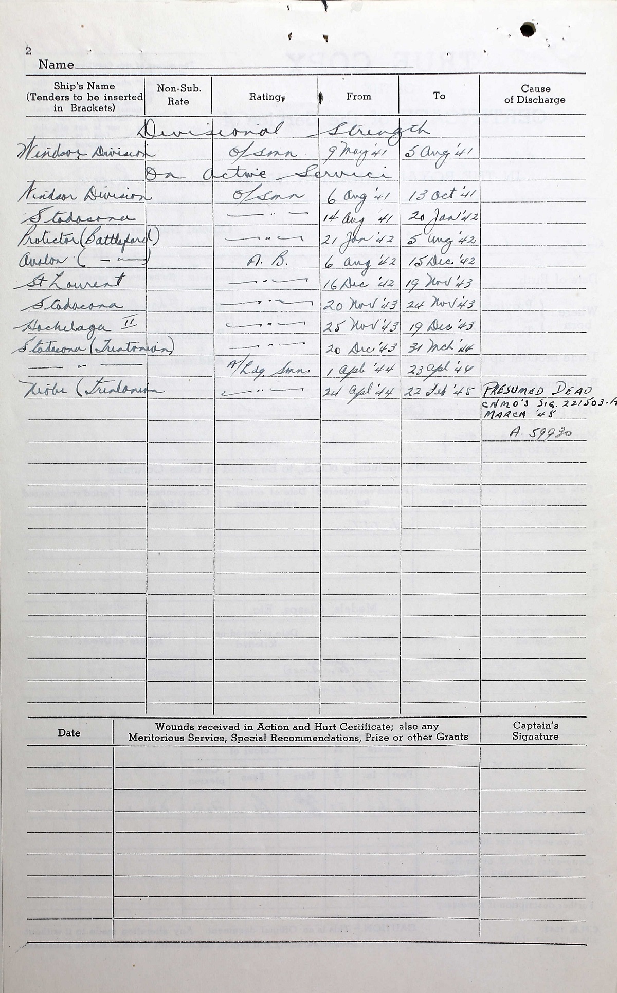 Ships served in: WINDSOR DIVISION RCNVR - Enlisted 09 May 1941. Commenced Active Service 06 Aug 1941 HMCS BATTLEFORD - Served in BATTLEFORD 21 Jan 1942 - 15 Dec 1942 as an OS and AB, RCNVR. Rated AB 06 Aug 1942 HMCS ST LAURENT - Served in ST LAURENT 16 Dec 1942 - 19 Nov 1943 as an AB, RCNVR HMCS TRENTONIAN - Drafted to TRENTONIAN 30 De 1943 as an AB, RCNVR. Rated A/LS 01 Apr 1944