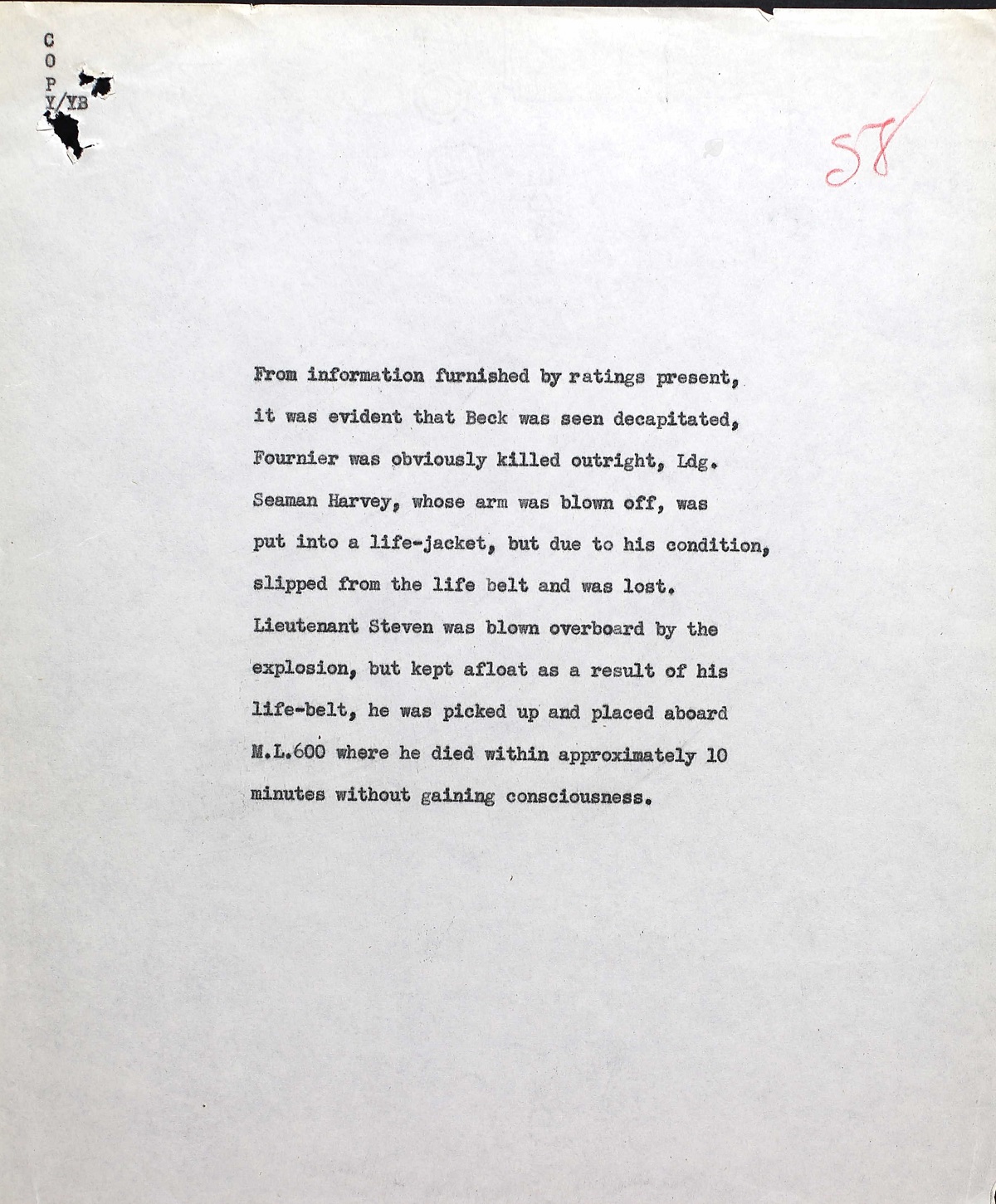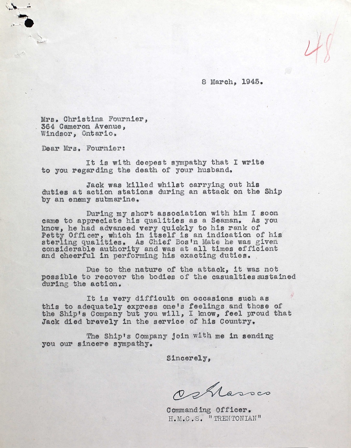 (JF04) Summary of witness statement on HMCS TRENTONIAN'S casualties (JF05-JF06) Letter's to LS Fournier's wife