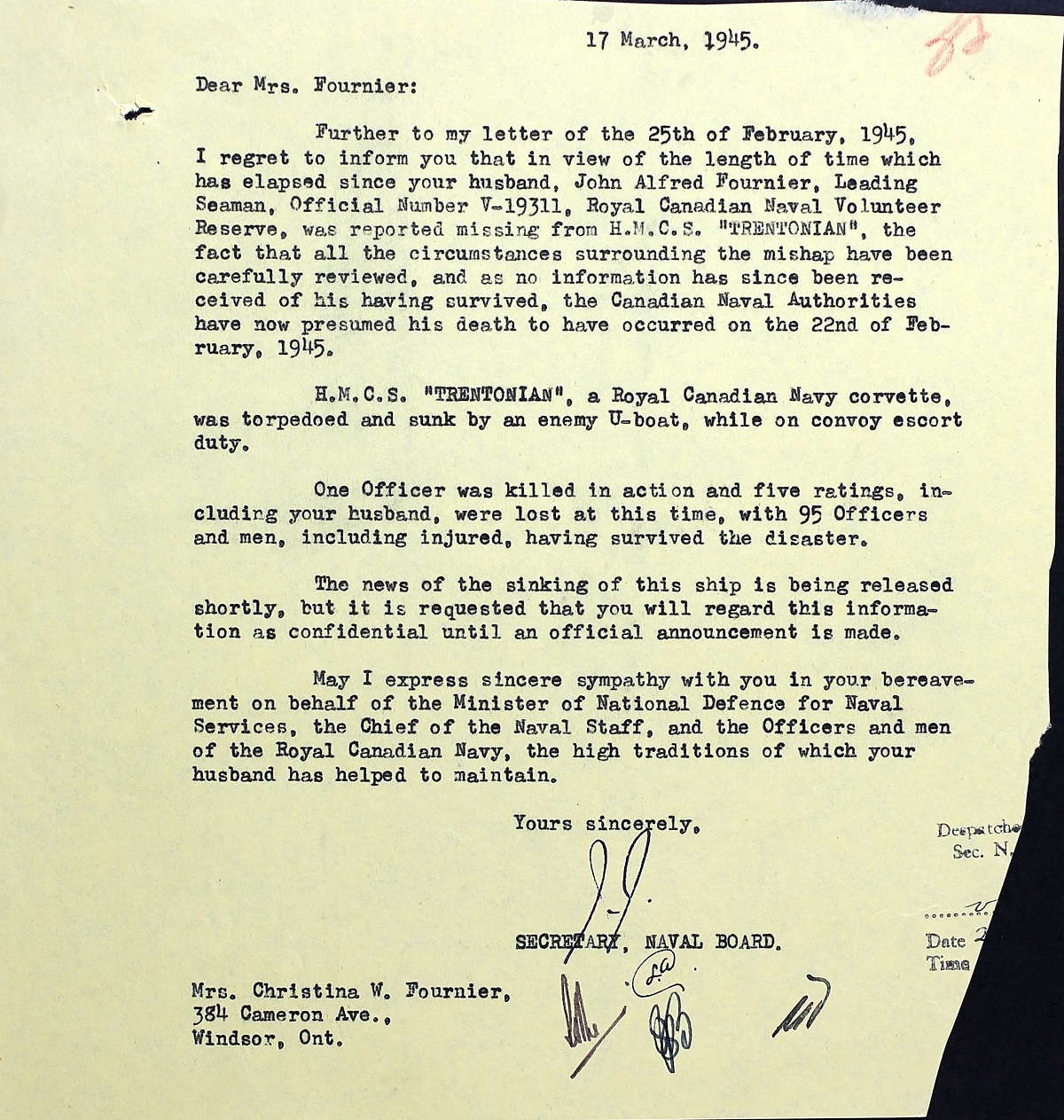 FOURNIER, John Alfred, LS, V19311, RCNVR, MPK - 22 Feb 1945, HMCS TRENTONIAN - Son of Frank Alfred and Ruby Agnes Fournier, of Windsor, Ontario. Husband of Christina W. Fournier, of Windsor, Ontario.