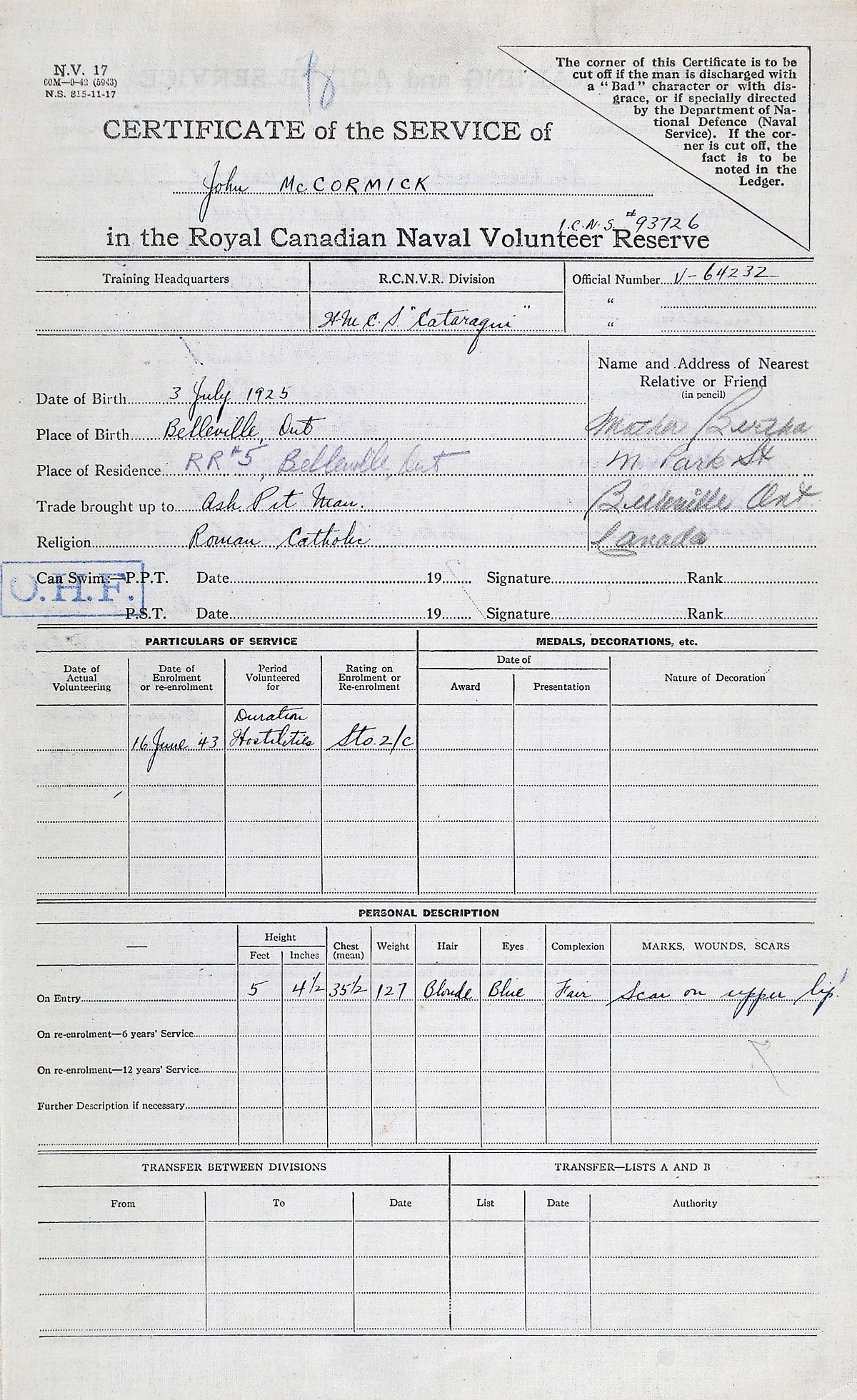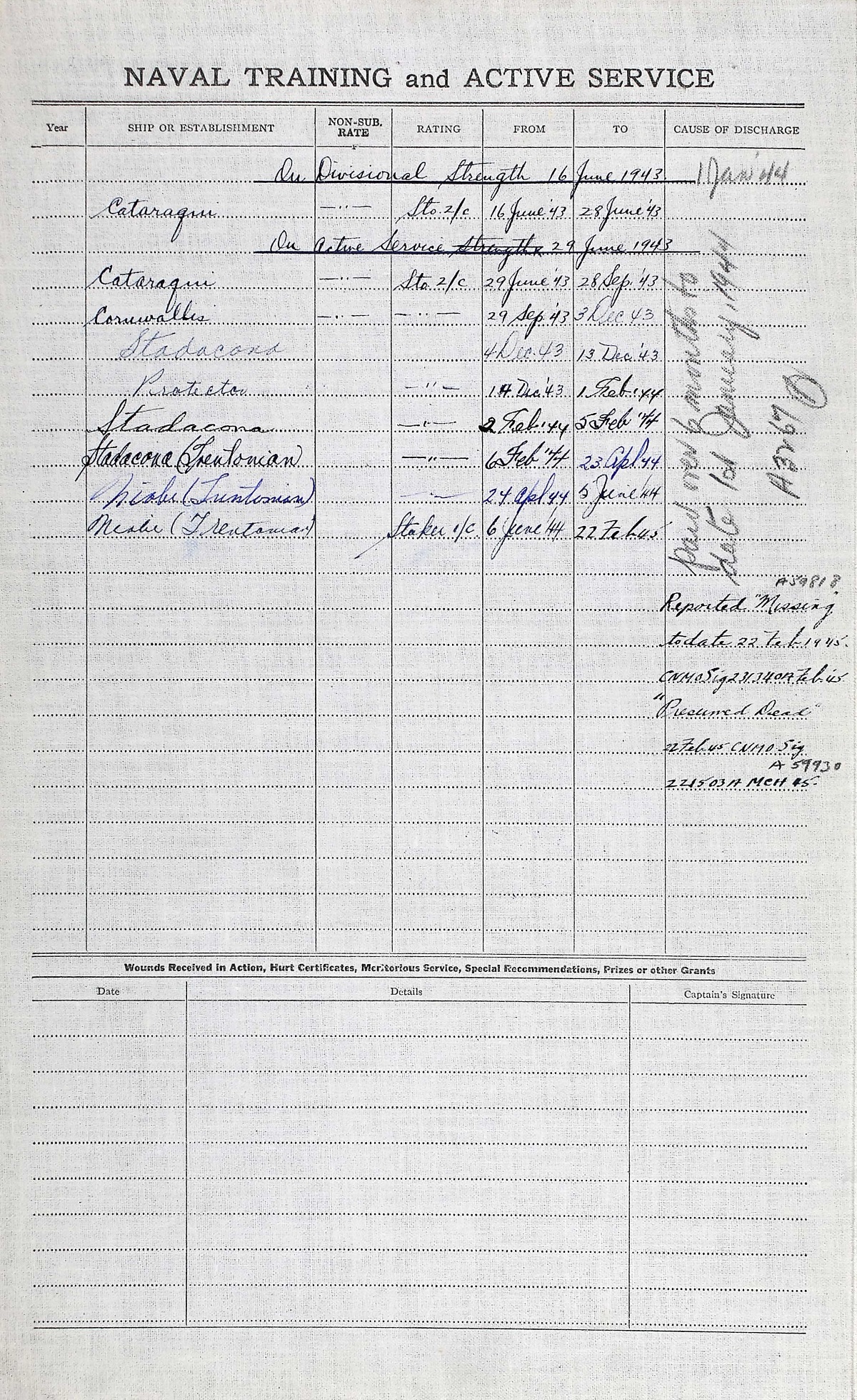 Ships served in: HMCS CATARAQUI - Enlisted 16 Jun 1943. Commenced Active Service 29 Jun 1943 HMCS TRENTONIAN - Drafted to TRENTONIAN 06 Feb 1944 as a Sto 2c, RCNVR. Rated Sto 1c 06 Jun 1944