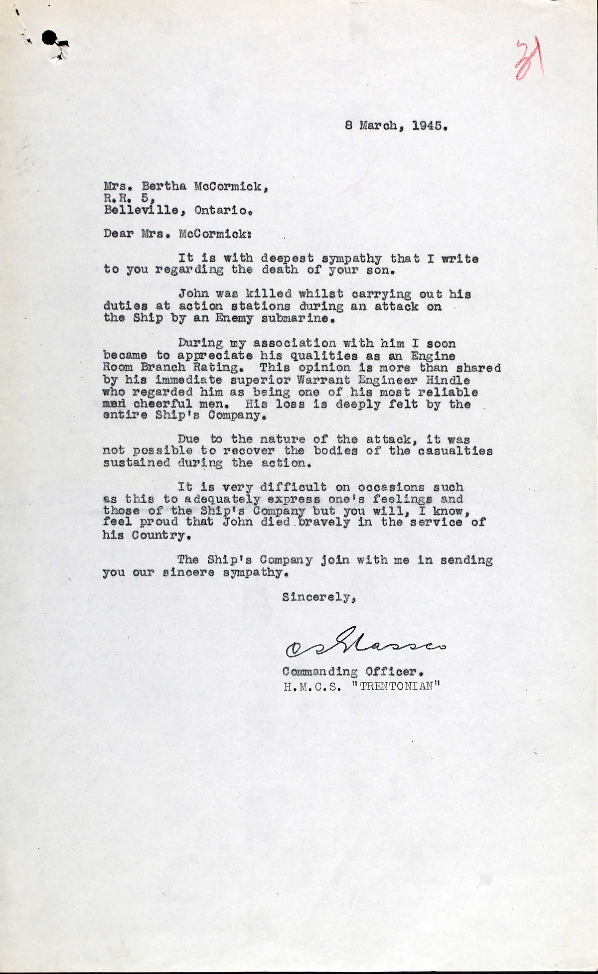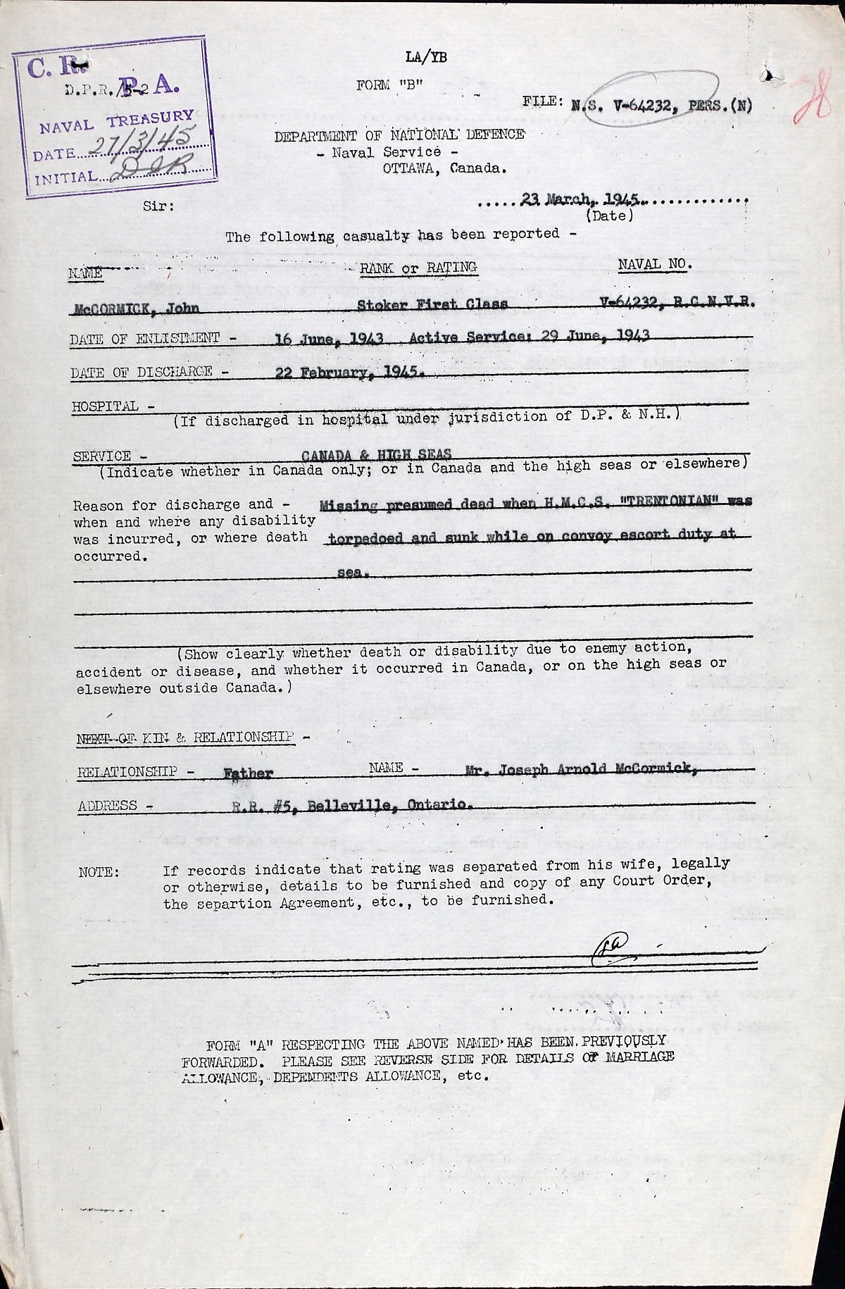MCCORMICK, John, Sto 1c, V64232, RCNVR, MPK - 22 Feb 1945, HMCS TRENTONIAN - Son of Joseph Arnold McCormick and Bertha McCormick, of Belleville, Ontario.