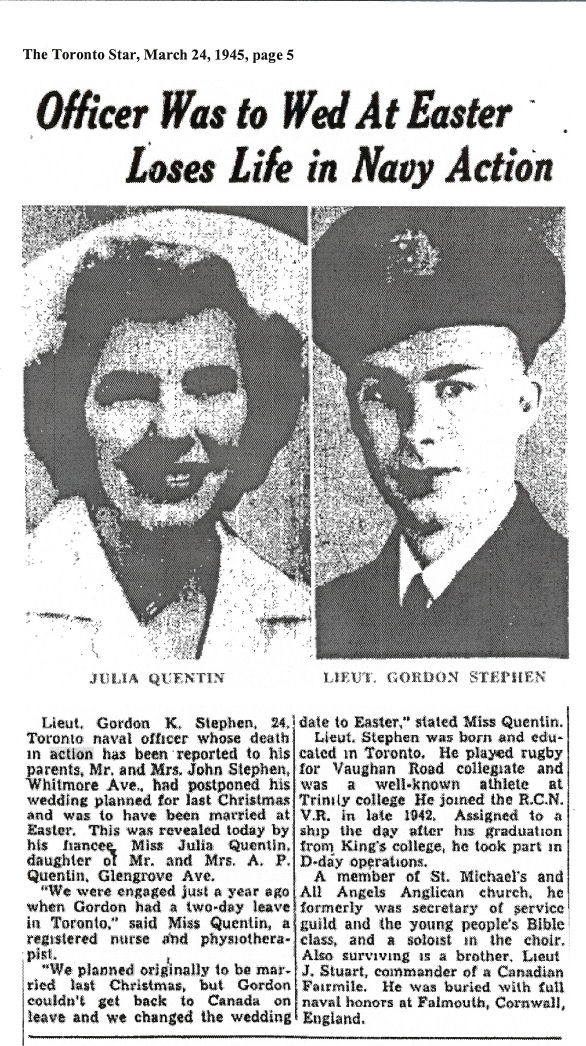 Lieut. Gordon K. Stephen, 24, Toronto naval officer whose death in action has been reported to his parents, Mr. and Mrs. John Stephen, Whitmore Ave. had postponed his wedding planned for last Christmas and was to have been married at Easter. This was revealed today by his fiancée, Miss Julia Quentin, daughter of Mr. and Mrs. A. P. Quentin, Glengrove Ave. "We were engaged just a year ago when Gordon had a two-day leave in Toronto", said Miss Quentin, a registered nurse and physiotherapist. "We planned originally to be married last Christmas, but Gordon couldn't get back to Canada on leave and we changed the wedding date to Easter," stated Miss Quentin. Lieut. Stephen was born and educated in Toronto. He played rugby for Vaughan Road Collegiate and was a well-known athlete at Trinity College. He joined the R.C.N.V.R. in late 1942. Assigned to a ship the day after his graduation from King's College, he took part in D-day operations. A member of St. Michael's and All Angels Anglican Church, he formerly was secretary of service guild and the young people's Bible class, and a soloist in the choir. Also surviving is a brother, Lieut. J. Stuart, commander of a Canadian Fairmile. He was buried with full naval honours at Falmouth, Cornwall, England, with his brother officers acting as pallbearers. R.C.N. padres Cecil Swan and Ernest Foote conducted the burial service.
