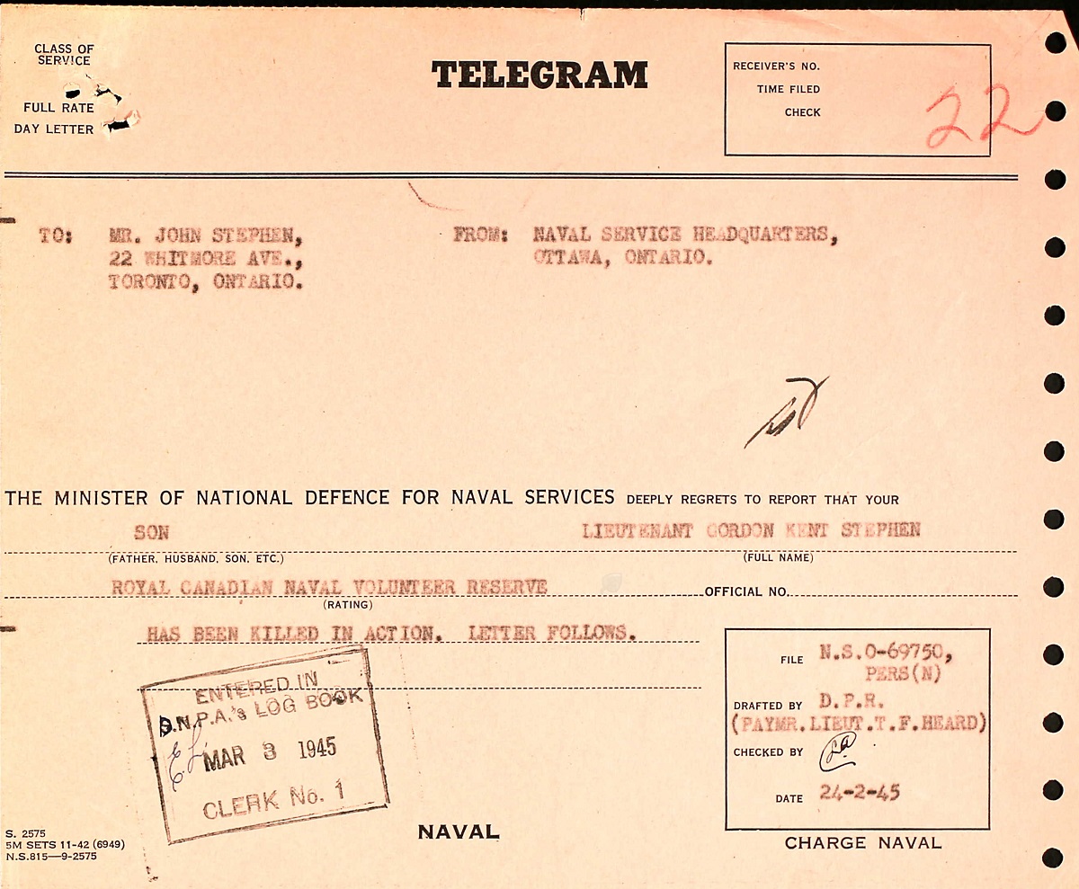 (GS01) Portrait of SLt Gordon Stephen (GS02-GS03) Record of Service (GS04) Appointment to HMCS TRENTONIAN (GS05) Telegram to Lt Stephen's father informing him of his death