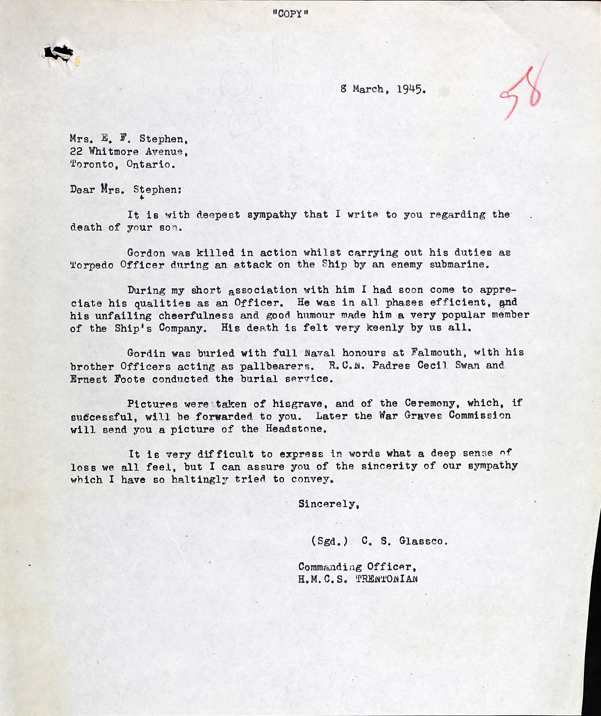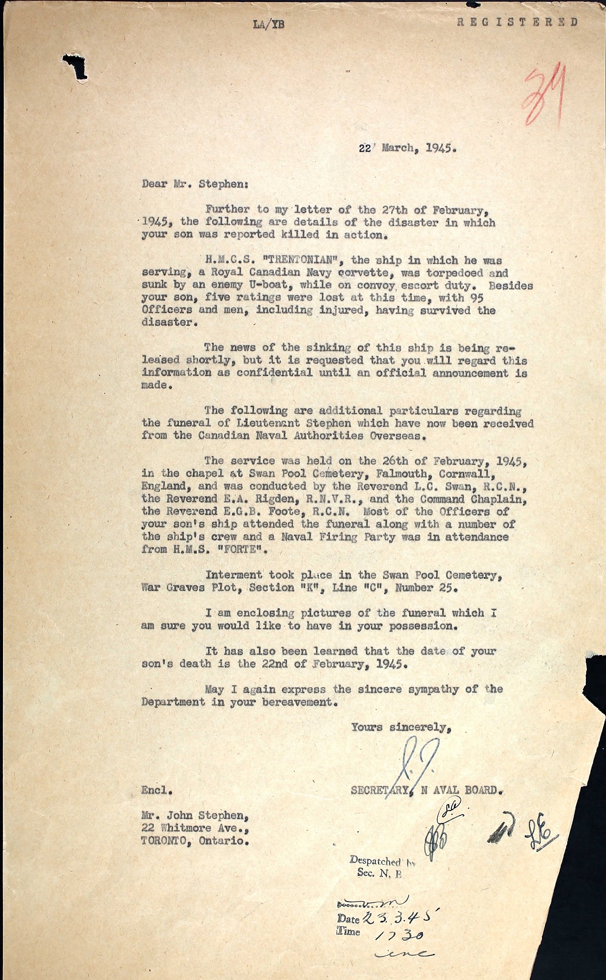 (GS06) Article on the death of Lt Stephen - The Toronto Star 24 Mar 1945 (transcribed above) (GS07) Summary of witness statement on HMCS TRENTONIAN'S casualties (GS08-GS09) Letter's to Lt Stephen's father and the death and burial of his son