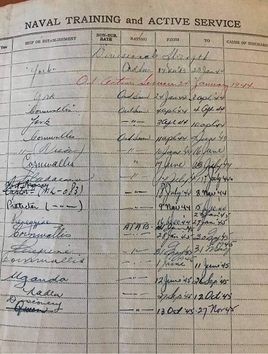 Ships served in: HMCS YORK - Enlisted 17 Nov 1943. Commenced Active Service 24 Jan 1944 HMCS VISION - Served in VISION 10 Jun 1944 - 16 Jun 1944 as an OS, RCNVR while in training at HMCS CORNWALLIS ML Q083 - Served in Q083 18 Jul 1944 - 15 Dec 1944 as an OS, RCNVR HMCS UGANDA - Served in UGANDA 12 Jun 1945 - 26 Sep 1945 HMCS DISCOVERY - Drafted to DISCOVERY 13 Oct 1945. Demobilized 27 Nov 1945