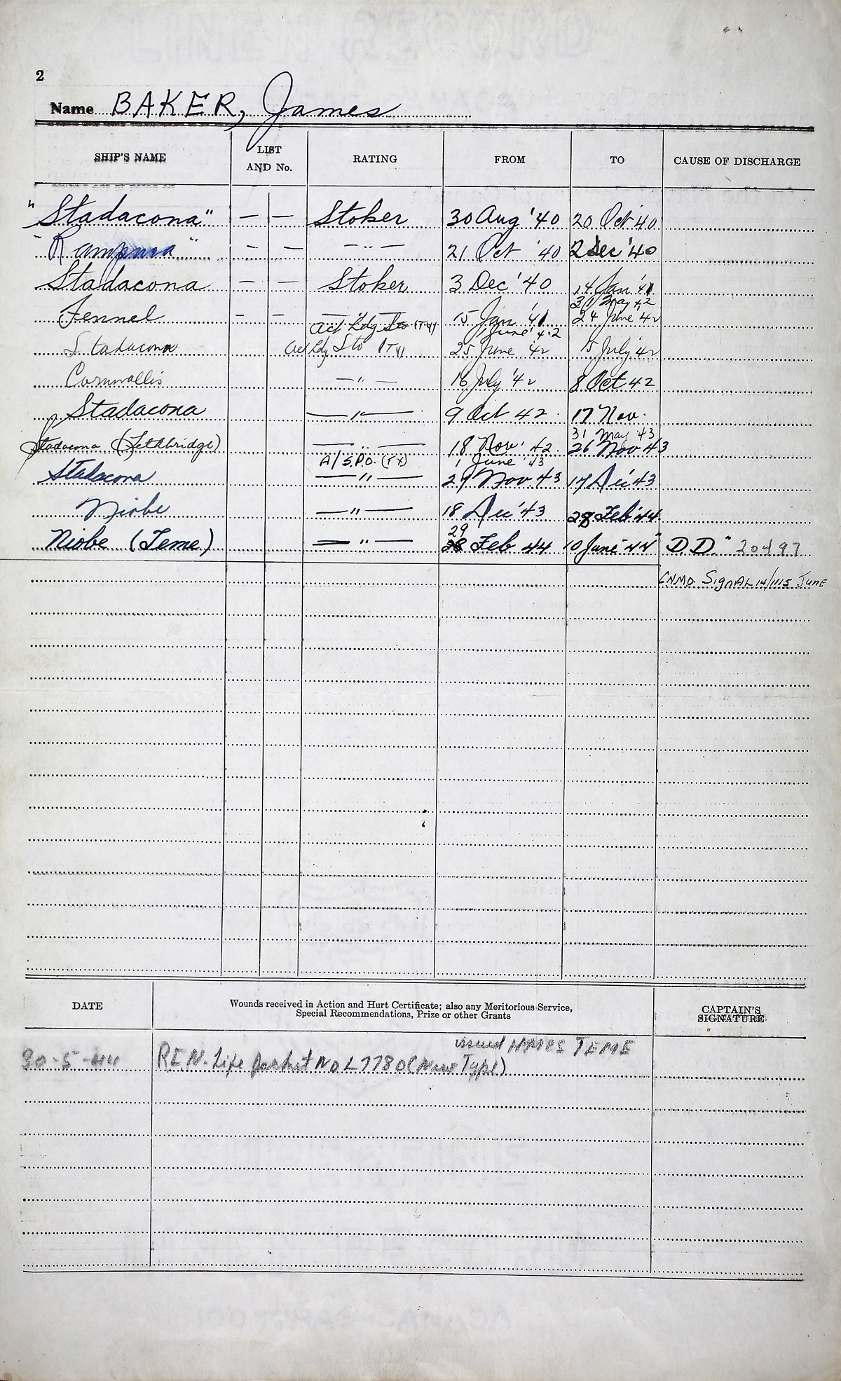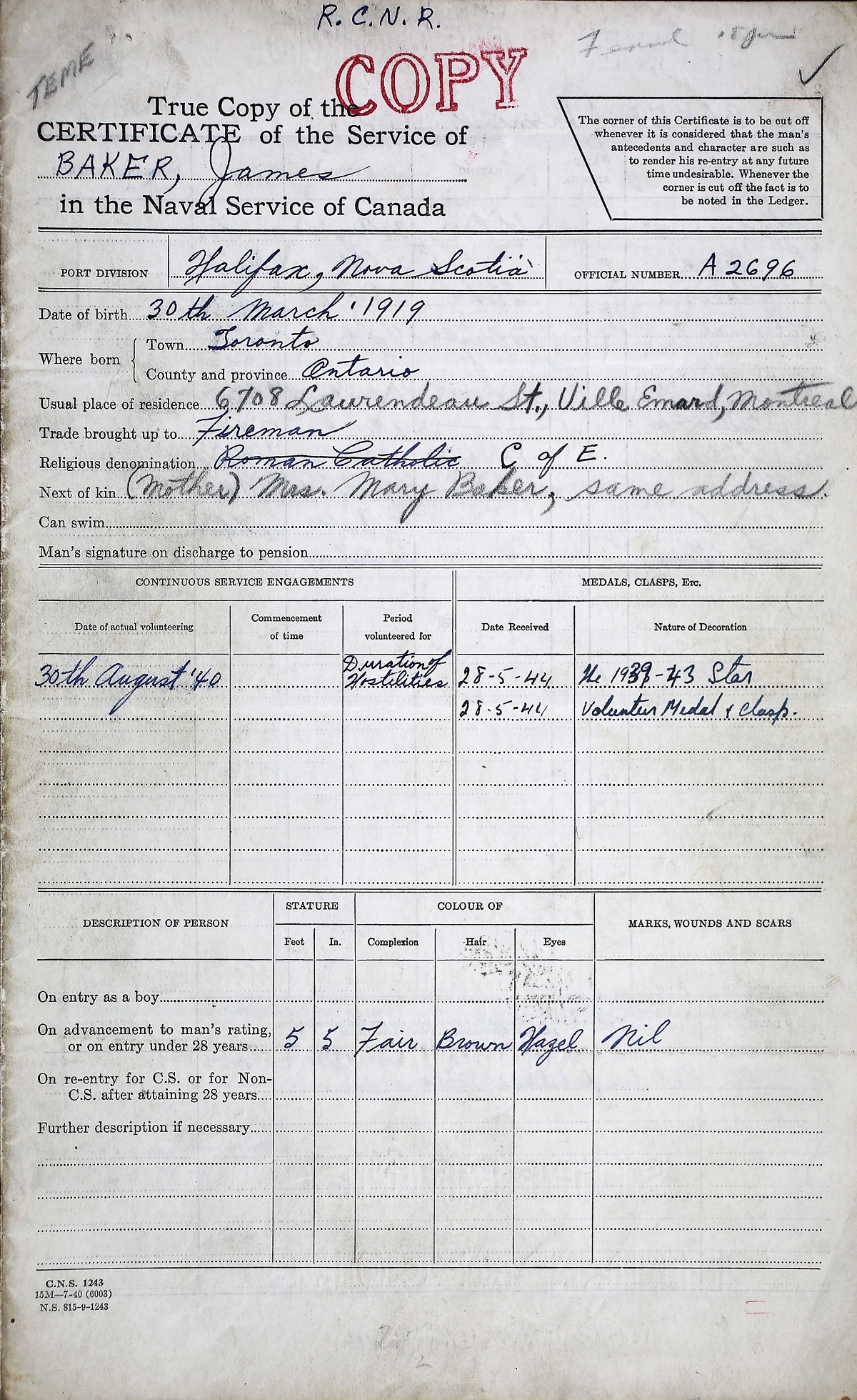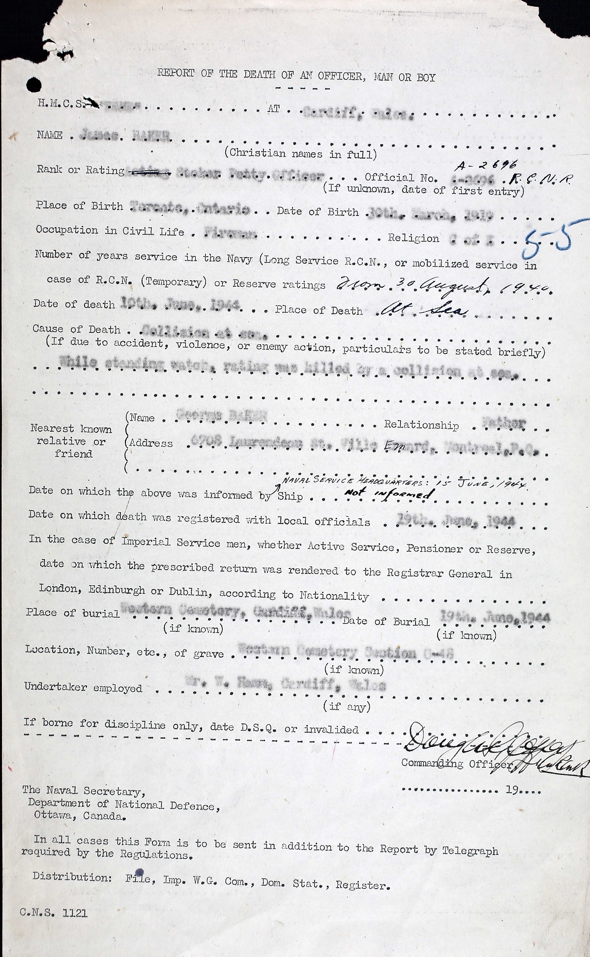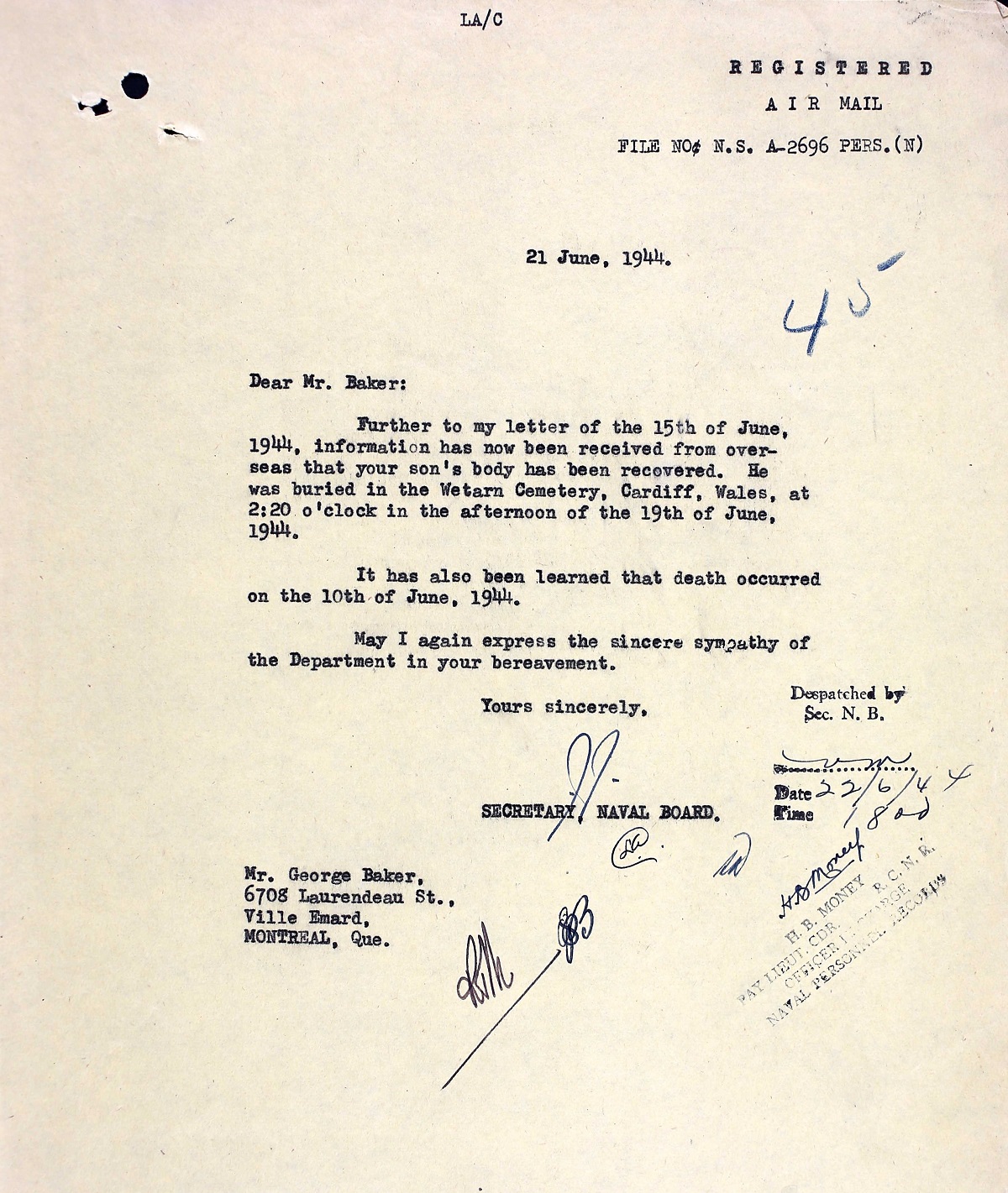 Sto PO Baker died as a result of a collision between HMCS TEME and the British aircraft carrier HMS TRACKER on 10 Jun 1944 while operating in the English Channel. He is buried in the Western Cemetery, Cardiff, Glamorganshire, Wales.